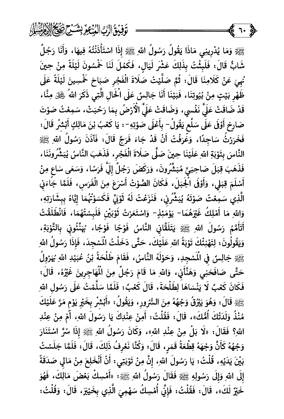 صلى الله عليه وسلم جَالِسٌ فِي الْمَسْجِدِ، وَحَوْلَهُ النَّاسُ، فَقَامَ طَلْحَةُ بْنُ عُبَيْدِ اللَّهِ يُهَرْوِلُ حَتَّى صَافَحَنِي وَهَنَّأَنِي، وَاللَّهِ مَا قَامَ رَجُلٌ مِنْ الْمُهَاجِرِينَ غَيْرُهُ قَالَ: فَكَانَ كَعْبٌ لَا يَنْسَاهَا لِطَلْحَةَ، قَالَ كَعْبٌ: فَلَمَّا سَلَّمْتُ عَلَى رَسُولِ اللَّهِ صلى الله عليه وسلم قَالَ: وَهُوَ يَبْرُقُ وَجْهُهُ مِنَ السُّرُورِ، وَيَقُولُ: ((أَبْشِرْ بِخَيْرِ يَوْمٍ مَرَّ عَلَيْكَ مُنْذُ وَلَدَتْكَ أُمُّكَ))، قَالَ: فَقُلْتُ: أَمِنْ عِنْدِكَ يَا رَسُولَ اللَّهِ، أَمْ مِنْ عِنْدِ اللَّهِ؟ فَقَالَ: ((لَا بَلْ مِنْ عِنْدِ اللَّهِ))، وَكَانَ رَسُولُ اللَّهِ صلى الله عليه وسلم إِذَا سُرَّ اسْتَنَارَ وَجْهُهُ كَأَنَّ وَجْهَهُ قِطْعَةُ قَمَرٍ قَالَ: وَكُنَّا نَعْرِفُ ذَلِكَ قَالَ: فَلَمَّا جَلَسْتُ بَيْنَ يَدَيْهِ، قُلْتُ: يَا رَسُولَ اللَّهِ، إِنَّ مِنْ تَوْبَتِي: أَنْ أَنْخَلِعَ مِنْ مَالِي صَدَقَةً إِلَى اللَّهِ وَإِلَى رَسُولِهِ صلى الله عليه وسلم فَقَالَ رَسُولُ اللَّهِ صلى الله عليه وسلم: ((أَمْسِكْ بَعْضَ مَالِكَ، فَهُوَ خَيْرٌ لَكَ))، قَالَ: فَقُلْتُ: فَإِنِّي أُمْسِكُ سَهْمِيَ الَّذِي بِخَيْبَرَ قَالَ: وَقُلْتُ: