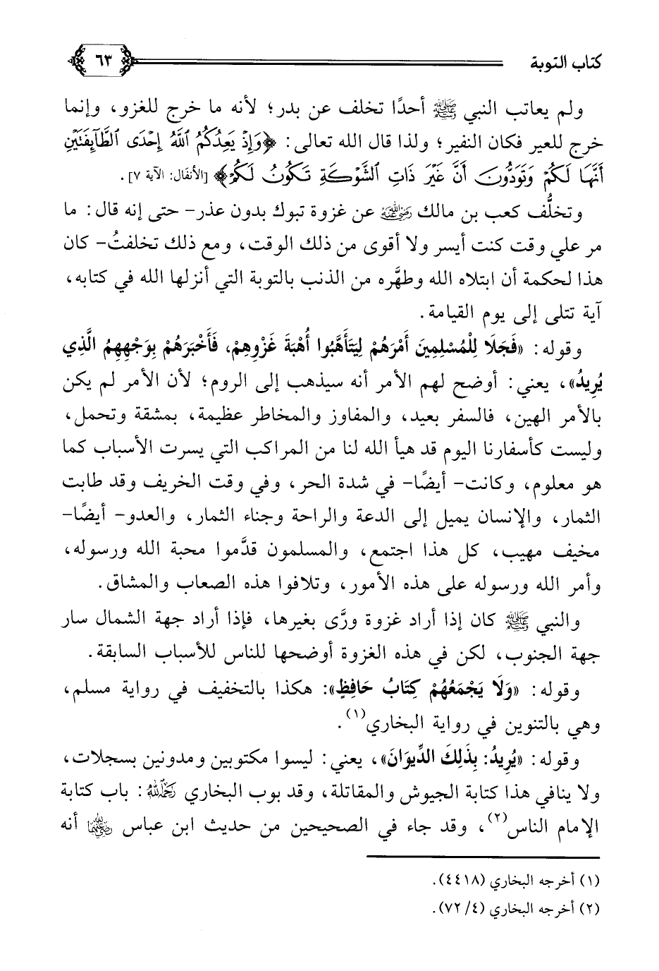 وتخلُّف كعب بن مالك رضي الله عنه عن غزوة تبوك بدون عذر- حتى إنه قال: ما مر علي وقت كنت أيسر ولا أقوى من ذلك الوقت، ومع ذلك تخلفتُ- كان هذا لحكمة أن ابتلاه الله وطهَّره من الذنب بالتوبة التي أنزلها الله في كتابه، آية تتلى إلى يوم القيامة.
