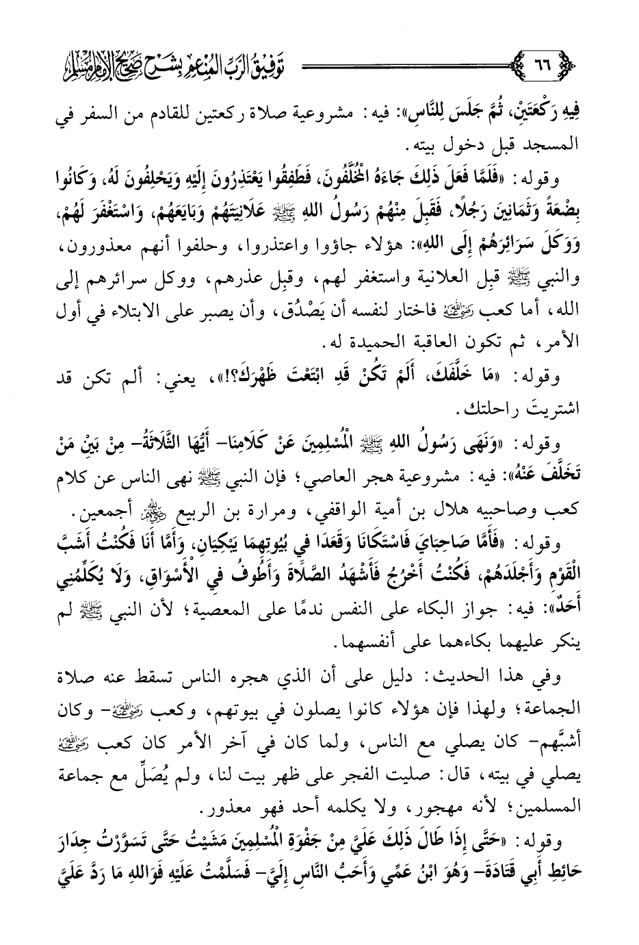 قوله: ((وَنَهَى رَسُولُ اللَّهِ صلى الله عليه وسلم الْمُسْلِمِينَ عَنْ كَلَامِنَا- أَيُّهَا الثَّلَاثَةُ- مِنْ بَيْنِ مَنْ تَخَلَّفَ عَنْهُ)): فيه: مشروعية هجر العاصي؛ فإن النبي صلى الله عليه وسلم نهى الناس عن كلام كعب وصاحبيه هلال بن أمية الواقفي، ومرارة بن الربيع رضي الله عنهم أجمعين.