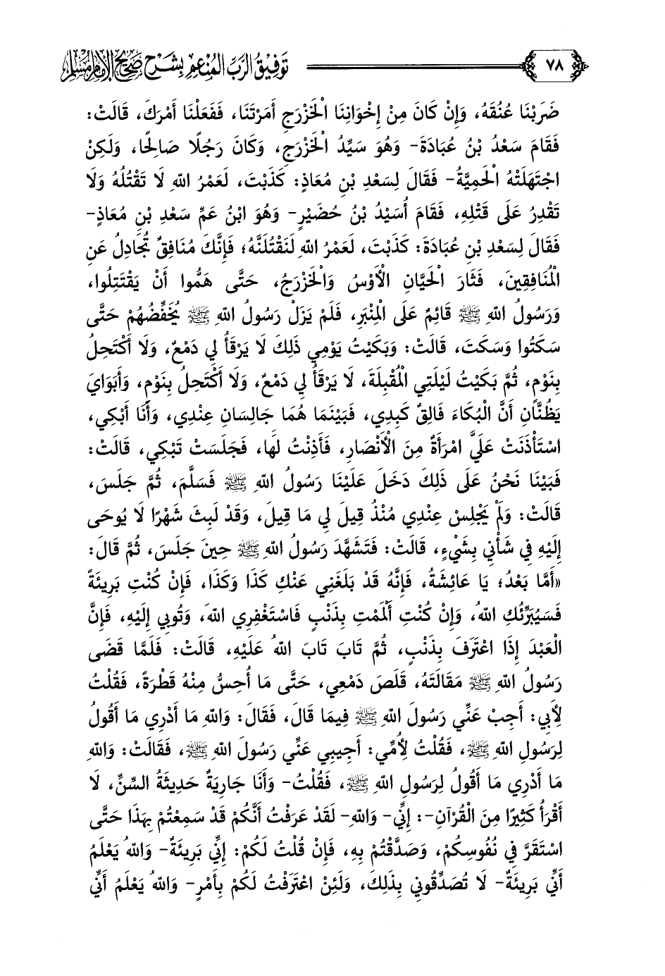 حَتَّى سَكَتُوا وَسَكَتَ، قَالَتْ: وَبَكَيْتُ يَوْمِي ذَلِكَ لَا يَرْقَأُ لِي دَمْعٌ، وَلَا أَكْتَحِلُ بِنَوْمٍ، ثُمَّ بَكَيْتُ لَيْلَتِي الْمُقْبِلَةَ، لَا يَرْقَأُ لِي دَمْعٌ، وَلَا أَكْتَحِلُ بِنَوْمٍ، وَأَبَوَايَ يَظُنَّانِ أَنَّ الْبُكَاءَ فَالِقٌ كَبِدِي، فَبَيْنَمَا هُمَا جَالِسَانِ عِنْدِي، وَأَنَا أَبْكِي، اسْتَأْذَنَتْ عَلَيَّ امْرَأَةٌ مِنْ الْأَنْصَارِ، فَأَذِنْتُ لَهَا، فَجَلَسَتْ تَبْكِي، قَالَتْ: فَبَيْنَا نَحْنُ عَلَى ذَلِكَ دَخَلَ عَلَيْنَا رَسُولُ اللَّهِ صلى الله عليه وسلم فَسَلَّمَ، ثُمَّ جَلَسَ، قَالَتْ: وَلَمْ يَجْلِسْ عِنْدِي مُنْذُ قِيلَ لِي مَا قِيلَ، وَقَدْ لَبِثَ شَهْرًا لَا يُوحَى إِلَيْهِ فِي شَأْنِي بِشَيْءٍ، قَالَتْ: فَتَشَهَّدَ رَسُولُ اللَّهِ صلى الله عليه وسلم حِينَ جَلَسَ، ثُمَّ قَالَ: ((أَمَّا بَعْدُ؛ يَا عَائِشَةُ، فَإِنَّهُ قَدْ بَلَغَنِي عَنْكِ كَذَا وَكَذَا، فَإِنْ كُنْتِ بَرِيئَةً فَسَيُبَرِّئُكِ اللَّهُ، وَإِنْ كُنْتِ أَلْمَمْتِ بِذَنْبٍ فَاسْتَغْفِرِي اللَّهَ، وَتُوبِي إِلَيْهِ، فَإِنَّ الْعَبْدَ إِذَا اعْتَرَفَ بِذَنْبٍ، ثُمَّ تَابَ تَابَ اللَّهُ عَلَيْهِ، قَالَتْ: فَلَمَّا قَضَى رَسُولُ اللَّهِ صلى الله عليه وسلم مَقَالَتَهُ، قَلَصَ دَمْعِي، حَتَّى مَا أُحِسُّ مِنْهُ قَطْرَةً، فَقُلْتُ لِأَبِي: أَجِبْ عَنِّي رَسُولَ اللَّهِ صلى الله عليه وسلم فِيمَا قَالَ، فَقَالَ: وَاللَّهِ مَا أَدْرِي مَا أَقُولُ لِرَسُولِ اللَّهِ صلى الله عليه وسلم، فَقُلْتُ لِأُمِّي: أَجِيبِي عَنِّي رَسُولَ اللَّهِ صلى الله عليه وسلم، فَقَالَتْ: وَاللَّهِ مَا أَدْرِي مَا أَقُولُ لِرَسُولِ اللَّهِ صلى الله عليه وسلم، فَقُلْتُ- وَأَنَا جَارِيَةٌ حَدِيثَةُ السِّنِّ، لَا أَقْرَأُ كَثِيرًا مِنَ الْقُرْآنِ-: إِنِّي- وَاللَّهِ- لَقَدْ عَرَفْتُ أَنَّكُمْ قَدْ
