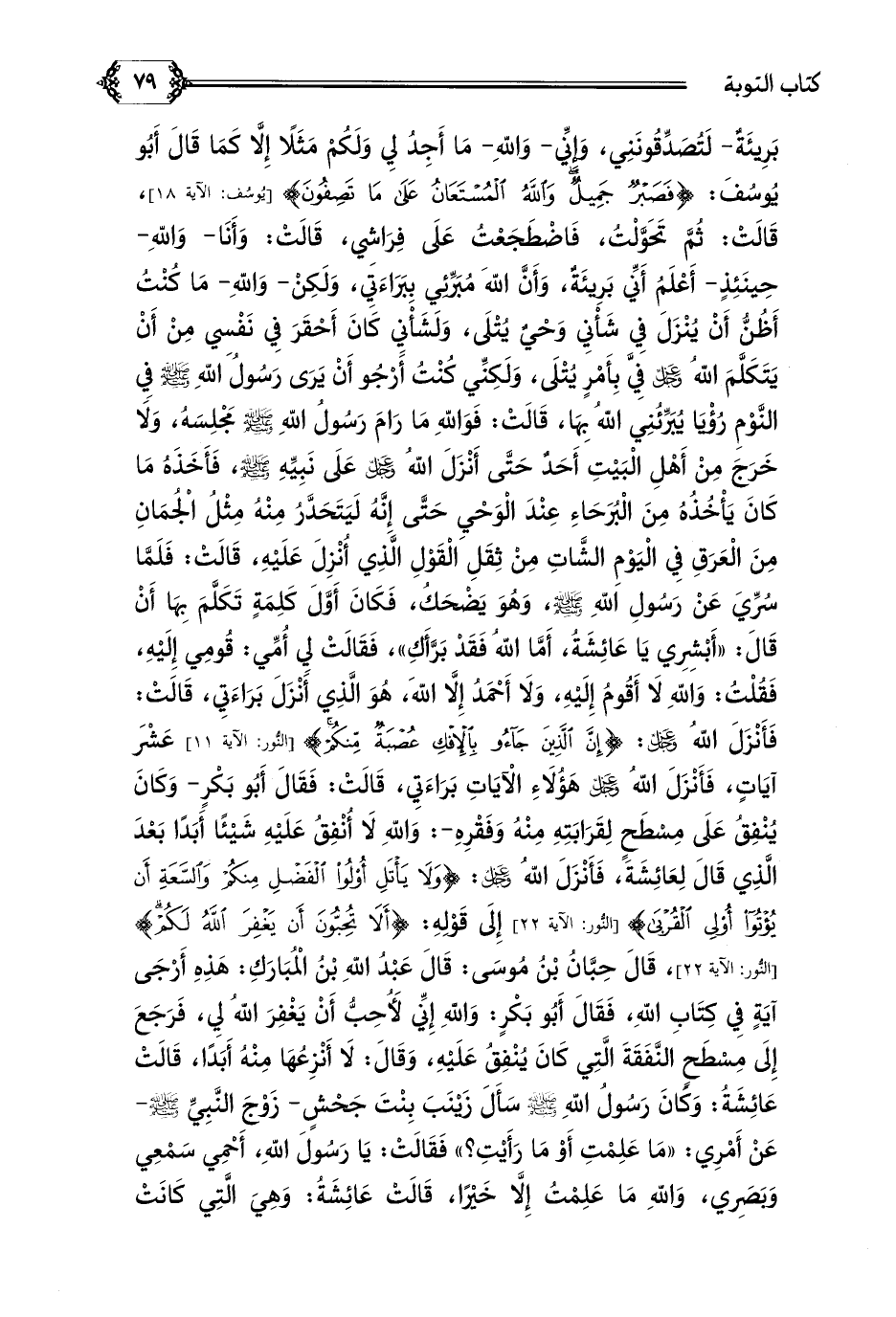 بَرِيئَةٌ- لَتُصَدِّقُونَنِي، وَإِنِّي- وَاللَّهِ- مَا أَجِدُ لِي وَلَكُمْ مَثَلًا إِلَّا كَمَا قَالَ أَبُو يُوسُفَ: {فَصَبْرٌ جَمِيلٌ وَاللَّهُ الْمُسْتَعَانُ عَلَى مَا تَصِفُونَ}، قَالَتْ: ثُمَّ تَحَوَّلْتُ، فَاضْطَجَعْتُ عَلَى فِرَاشِي، قَالَتْ: وَأَنَا- وَاللَّهِ- حِينَئِذٍ- أَعْلَمُ أَنِّي بَرِيئَةٌ، وَأَنَّ اللَّهَ مُبَرِّئِي بِبَرَاءَتِي، وَلَكِنْ- وَاللَّهِ- مَا كُنْتُ أَظُنُّ أَنْ يُنْزَلَ فِي شَأْنِي وَحْيٌ يُتْلَى، وَلَشَأْنِي كَانَ أَحْقَرَ فِي نَفْسِي مِنْ أَنْ يَتَكَلَّمَ اللَّهُ عز وجل فِيَّ بِأَمْرٍ يُتْلَى، وَلَكِنِّي كُنْتُ أَرْجُو أَنْ يَرَى رَسُولُ اللَّهِ صلى الله عليه وسلم فِي النَّوْمِ رُؤْيَا يُبَرِّئُنِي اللَّهُ بِهَا، قَالَتْ: فَوَاللَّهِ مَا رَامَ رَسُولُ اللَّهِ صلى الله عليه وسلم مَجْلِسَهُ، وَلَا خَرَجَ مِنْ أَهْلِ الْبَيْتِ أَحَدٌ حَتَّى أَنْزَلَ اللَّهُ عز وجل عَلَى نَبِيِّهِ صلى الله عليه وسلم، فَأَخَذَهُ مَا كَانَ يَأْخُذُهُ مِنَ الْبُرَحَاءِ عِنْدَ الْوَحْيِ حَتَّى إِنَّهُ لَيَتَحَدَّرُ مِنْهُ مِثْلُ الْجُمَانِ مِنَ الْعَرَقِ فِي الْيَوْمِ الشَّاتِ مِنْ ثِقَلِ الْقَوْلِ الَّذِي أُنْزِلَ عَلَيْهِ، قَالَتْ: فَلَمَّا سُرِّيَ عَنْ رَسُولِ اللَّهِ صلى الله عليه وسلم، وَهُوَ يَضْحَكُ، فَكَانَ أَوَّلَ كَلِمَةٍ تَكَلَّمَ بِهَا أَنْ قَالَ: ((أَبْشِرِي يَا عَائِشَةُ، أَمَّا اللَّهُ فَقَدْ بَرَّأَكِ))، فَقَالَتْ لِي أُمِّي: قُومِي إِلَيْهِ، فَقُلْتُ: وَاللَّهِ لَا أَقُومُ إِلَيْهِ، وَلَا أَحْمَدُ إِلَّا