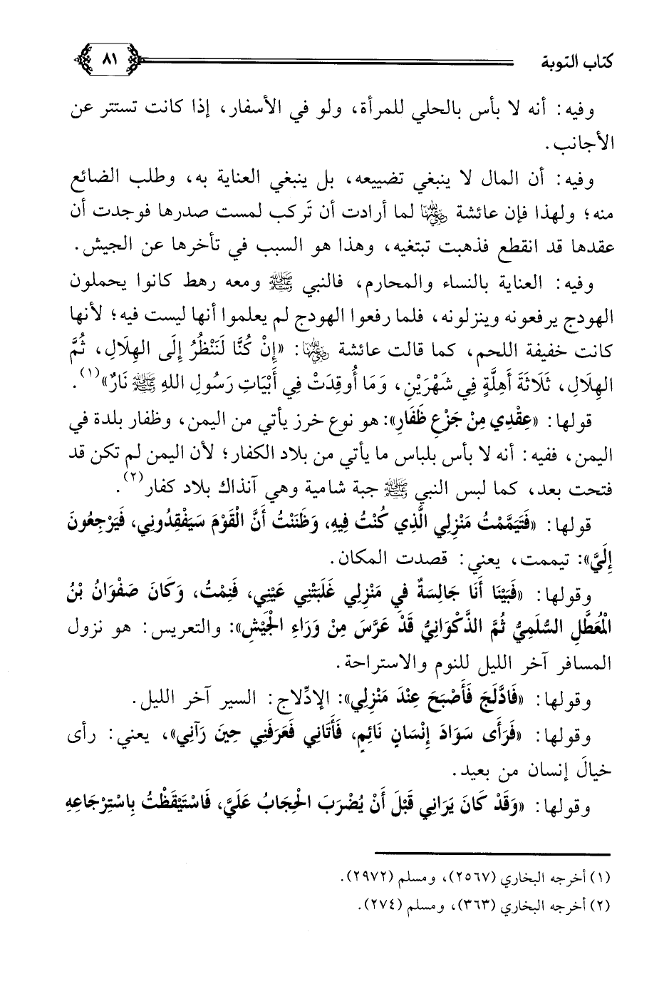 وفيه: العناية بالنساء والمحارم، فالنبي صلى الله عليه وسلم ومعه رهط كانوا يحملون الهودج يرفعونه وينزلونه، فلما رفعوا الهودج لم يعلموا أنها ليست فيه؛ لأنها كانت خفيفة اللحم، كما قالت عائشة رضي الله عنها: ((إِنْ كُنَّا لَنَنْظُرُ إِلَى الهِلالِ، ثُمَّ الهِلالِ، ثَلاثَةَ أَهِلَّةٍ فِي شَهْرَيْنِ، وَمَا أُوقِدَتْ فِي أَبْيَاتِ رَسُولِ اللَّهِ صَلَّى اللهُ عَلَيْهِ وَسَلَّمَ نَارٌ)) (¬١)