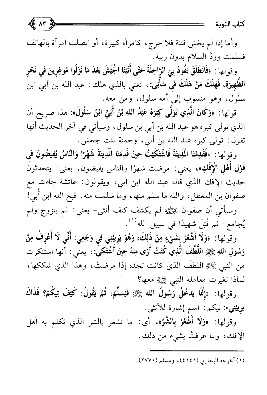 وقولها: ((فَقَدِمْنَا الْمَدِينَةَ فَاشْتَكَيْتُ حِينَ قَدِمْنَا الْمَدِينَةَ شَهْرًا وَالنَّاسُ يُفِيضُونَ فِي قَوْلِ أَهْلِ الْإِفْكِ))، يعني: مرضت شهرًا والناس يفيضون، يعني: يتحدثون حديث الإفك الذي قاله عبد الله بن أبي، ويقولون: عائشة جاءت مع صفوان بن المعطل، والله ما سلم منها، وما سلمت منه. قبح الله ابن أُبي!