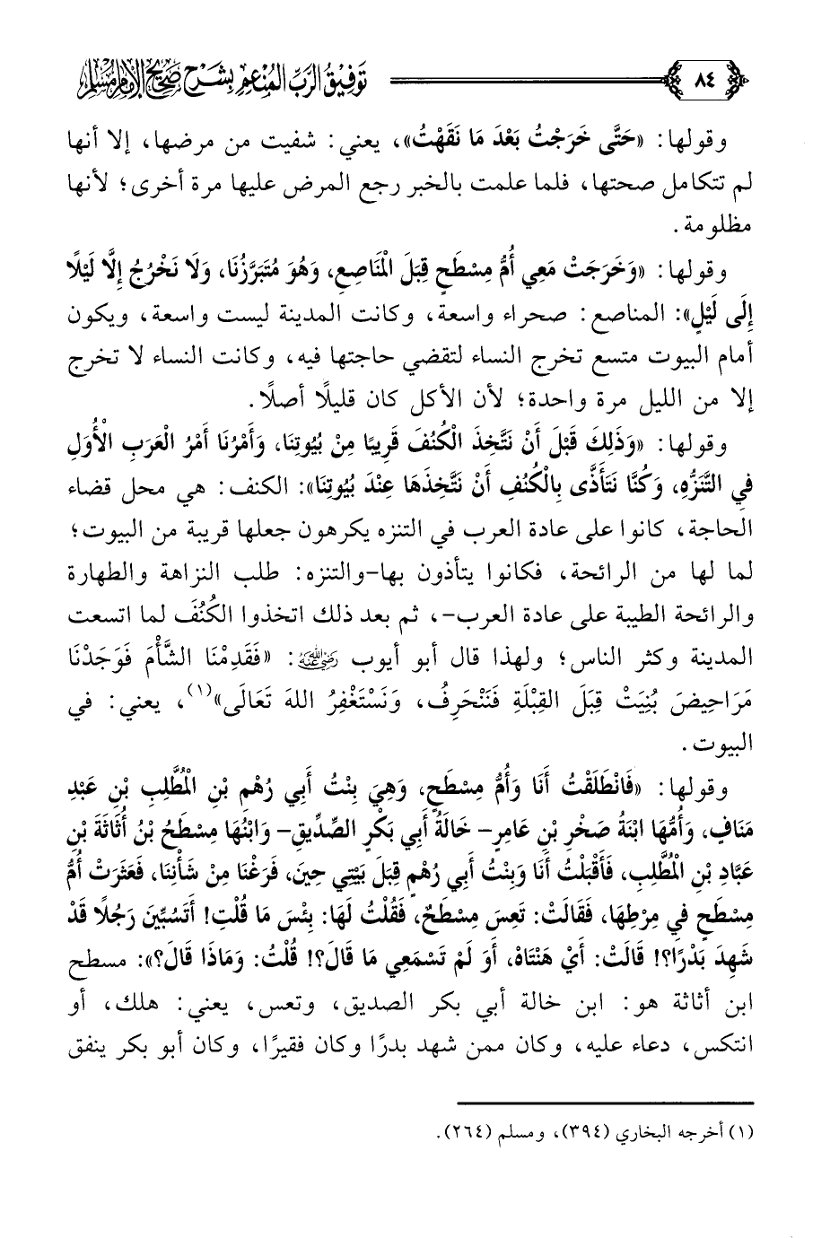 وقولها: ((فَانْطَلَقْتُ أَنَا وَأُمُّ مِسْطَحٍ، وَهِيَ بِنْتُ أَبِي رُهْمِ بْنِ الْمُطَّلِبِ بْنِ عَبْدِ مَنَافٍ، وَأُمُّهَا ابْنَةُ صَخْرِ بْنِ عَامِرٍ- خَالَةُ أَبِي بَكْرٍ الصِّدِّيقِ- وَابْنُهَا مِسْطَحُ بْنُ أُثَاثَةَ بْنِ عَبَّادِ بْنِ الْمُطَّلِبِ، فَأَقْبَلْتُ أَنَا وَبِنْتُ أَبِي رُهْمٍ قِبَلَ بَيْتِي حِينَ، فَرَغْنَا مِنْ شَأْنِنَا، فَعَثَرَتْ أُمُّ مِسْطَحٍ فِي مِرْطِهَا، فَقَالَتْ: تَعِسَ مِسْطَحٌ، فَقُلْتُ لَهَا: بِئْسَ مَا قُلْتِ! أَتَسُبِّينَ رَجُلًا قَدْ شَهِدَ بَدْرًا؟ ! قَالَتْ: أَيْ هَنْتَاهْ، أَوَ لَمْ تَسْمَعِي مَا قَالَ؟ ! قُلْتُ: وَمَاذَا قَالَ؟ )): مسطح بن أثاثة هو: ابن خالة أبي بكر الصديق، وتعس، يعني: هلك، أو انتكس، دعاء عليه، وكان ممن شهد بدرًا وكان فقيرًا، وكان أبو بكر ينفق