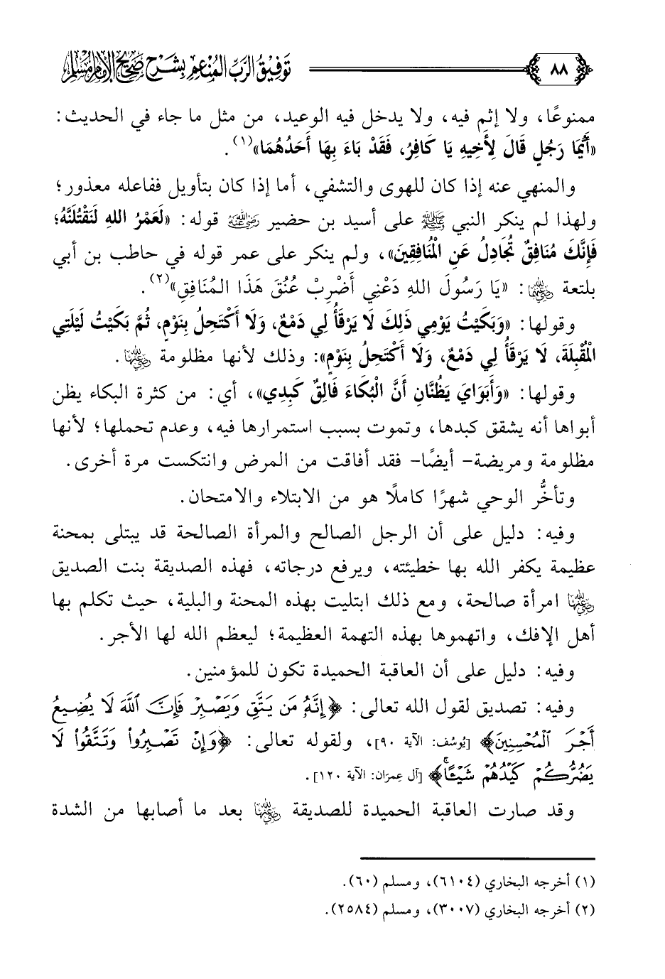 والمنهي عنه إذا كان للهوى والتشفي، أما إذا كان بتأويل ففاعله معذور؛ ولهذا لم ينكر النبي صلى الله عليه وسلم على أسيد بن حضير رضي الله عنه قوله: ((لَعَمْرُ اللَّهِ لَنَقْتُلَنَّهُ؛ فَإِنَّكَ مُنَافِقٌ تُجَادِلُ عَنِ الْمُنَافِقِينَ))، ولم ينكر على عمر قوله في حاطب بن أبي بلتعة رضي الله عنهما: ((يَا رَسُولَ اللَّهِ دَعْنِي أَضْرِبْ عُنُقَ هَذَا المُنَافِقِ)) (¬٢).