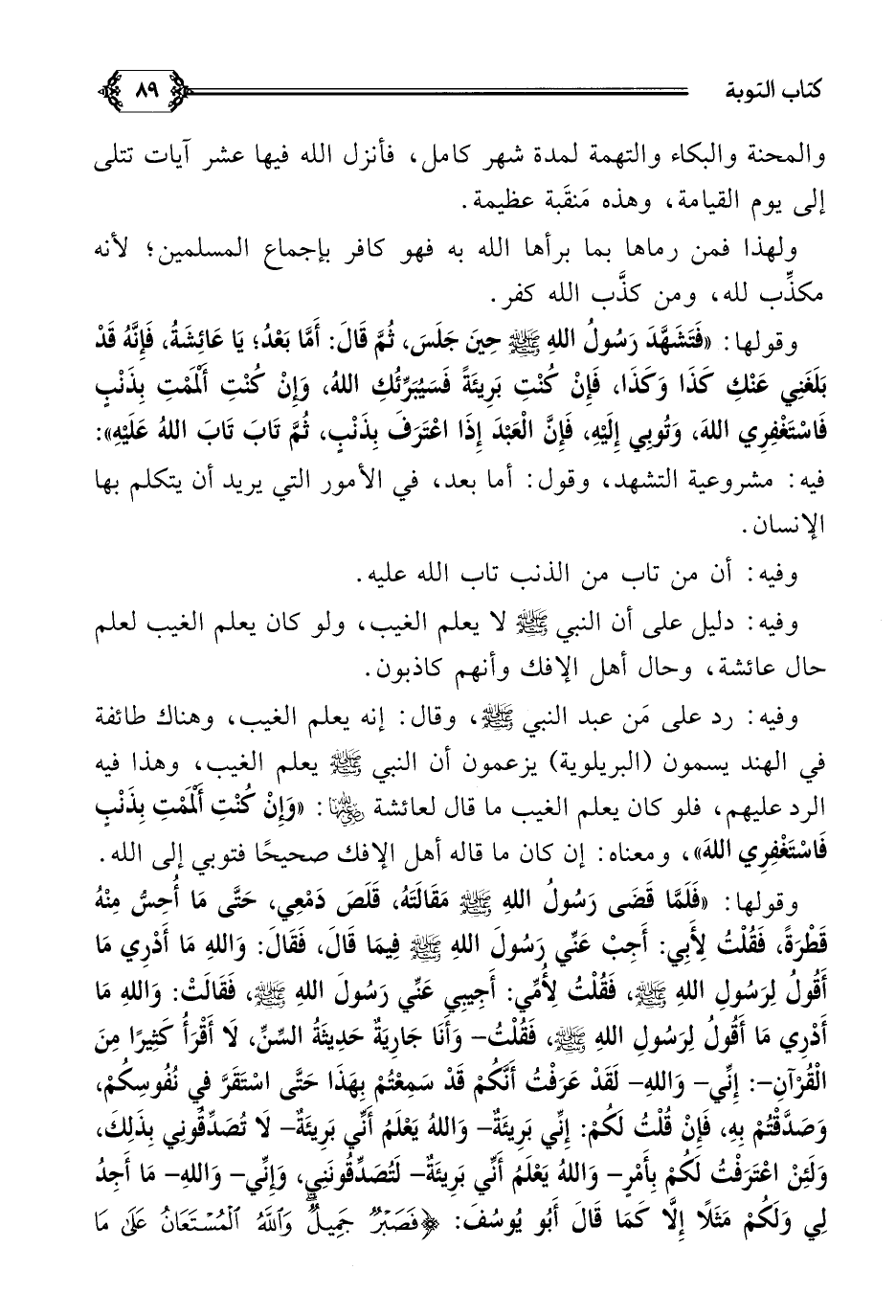 وفيه: رد على مَن عبد النبي صلى الله عليه وسلم، وقال: إنه يعلم الغيب، وهناك طائفة في الهند يسمون (البريلوية) يزعمون أن النبي صلى الله عليه وسلم يعلم الغيب، وهذا فيه الرد عليهم، فلو كان يعلم الغيب ما قال لعائشة: ((وَإِنْ كُنْتِ أَلْمَمْتِ بِذَنْبٍ فَاسْتَغْفِرِي اللَّهَ))، ومعناه: إن كان ما قاله أهل الإفك صحيحًا فتوبي إلى الله.