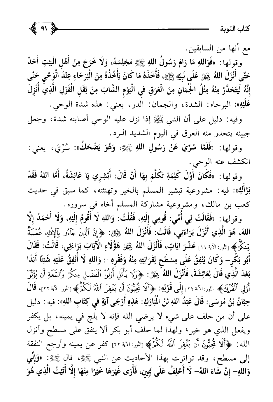 وقولها: ((فَقَالَتْ لِي أُمِّي: قُومِي إِلَيْهِ، فَقُلْتُ: وَاللَّهِ لَا أَقُومُ إِلَيْهِ، وَلَا أَحْمَدُ إِلَّا اللَّهَ، هُوَ الَّذِي أَنْزَلَ بَرَاءَتِي، قَالَتْ: فَأَنْزَلَ اللَّهُ عز وجل: {إِنَّ الَّذِينَ جَاءُوا بِالإِفْكِ عُصْبَةٌ مِنْكُمْ} عَشْرَ آيَاتٍ، فَأَنْزَلَ اللَّهُ عز وجل هَؤُلَاءِ الْآيَاتِ بَرَاءَتِي، قَالَتْ: فَقَالَ أَبُو بَكْرٍ- وَكَانَ يُنْفِقُ عَلَى مِسْطَحٍ لِقَرَابَتِهِ مِنْهُ وَفَقْرِهِ-: وَاللَّهِ لَا أُنْفِقُ عَلَيْهِ شَيْئًا أَبَدًا بَعْدَ الَّذِي قَالَ لِعَائِشَةَ، فَأَنْزَلَ اللَّهُ عز وجل: {وَلا يَأْتَلِ أُولُو الْفَضْلِ مِنْكُمْ وَالسَّعَةِ أَنْ يُؤْتُوا أُولِي الْقُرْبَى} إِلَى قَوْلِهِ: {أَلا تُحِبُّونَ أَنْ يَغْفِرَ اللَّهُ لَكُمْ}، قَالَ حِبَّانُ بْنُ مُوسَى: قَالَ عَبْدُ اللهِ بْنُ الْمُبَارَكِ: هَذِهِ أَرْجَى آيَةٍ فِي كِتَابِ اللَّهِ)): فيه: دليل على أن من حلف على شيء لا يرضي الله فإنه لا يلج في يمينه، بل يكفر ويفعل الذي هو خير؛ ولهذا لما حلف أبو بكر ألا ينفق على مسطح وأنزل الله: {ألا تحبون أن يغفر الله لكم} كفر عن يمينه وأرجع النفقة إلى مسطح، وقد تواترت بهذا الأحاديث عن النبي صلى الله عليه وسلم، قال عليه الصلاة والسلام: ((وَإِنِّي وَاللَّهِ- إِنْ شَاءَ اللَّهُ- لا أَحْلِفُ عَلَى يَمِينٍ، فَأَرَى غَيْرَهَا خَيْرًا مِنْهَا إِلَّا أَتَيْتُ الَّذِي هُوَ