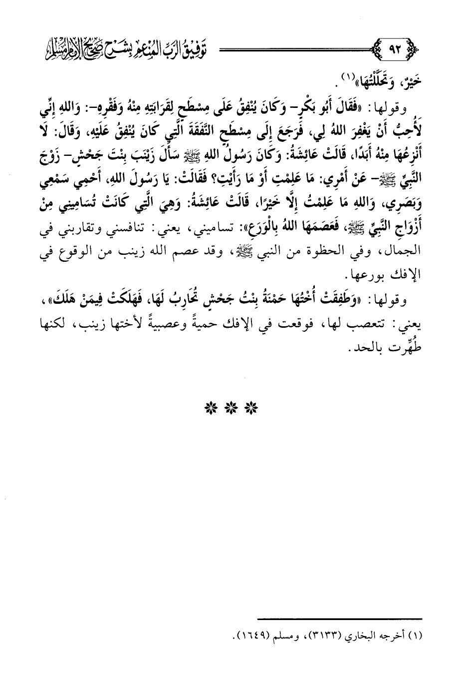 وقولها: ((فَقَالَ أَبُو بَكْرٍ- وَكَانَ يُنْفِقُ عَلَى مِسْطَحٍ لِقَرَابَتِهِ مِنْهُ وَفَقْرِهِ-: وَاللَّهِ إِنِّي لَأُحِبُّ أَنْ يَغْفِرَ اللَّهُ لِي، فَرَجَعَ إِلَى مِسْطَحٍ النَّفَقَةَ الَّتِي كَانَ يُنْفِقُ عَلَيْهِ، وَقَالَ: لَا أَنْزِعُهَا مِنْهُ أَبَدًا، قَالَتْ عَائِشَةُ: وَكَانَ رَسُولُ اللَّهِ صلى الله عليه وسلم سَأَلَ زَيْنَبَ بِنْتَ جَحْشٍ- زَوْجَ النَّبِيِّ صلى الله عليه وسلم- عَنْ أَمْرِي: مَا عَلِمْتِ أَوْ مَا رَأَيْتِ؟ فَقَالَتْ: يَا رَسُولَ اللَّهِ، أَحْمِي سَمْعِي وَبَصَرِي، وَاللَّهِ مَا عَلِمْتُ إِلَّا خَيْرًا، قَالَتْ عَائِشَةُ: وَهِيَ الَّتِي كَانَتْ تُسَامِينِي مِنْ أَزْوَاجِ النَّبِيِّ صلى الله عليه وسلم، فَعَصَمَهَا اللَّهُ بِالْوَرَعِ)): تساميني، يعني: تنافسني وتقاربني في الجمال، وفي الحظوة من النبي صلى الله عليه وسلم، وقد عصم الله زينب من الوقوع في الإفك بورعها.