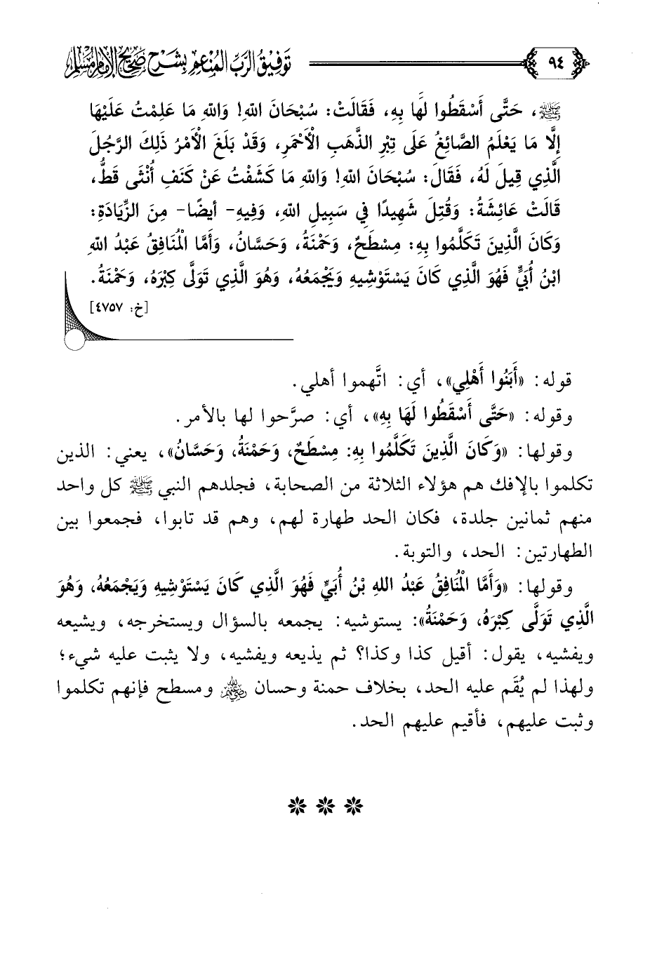 صلى الله عليه وسلم، حَتَّى أَسْقَطُوا لَهَا بِهِ، فَقَالَتْ: سُبْحَانَ اللَّهِ! وَاللَّهِ مَا عَلِمْتُ عَلَيْهَا إِلَّا مَا يَعْلَمُ الصَّائِغُ عَلَى تِبْرِ الذَّهَبِ الْأَحْمَرِ، وَقَدْ بَلَغَ الْأَمْرُ ذَلِكَ الرَّجُلَ الَّذِي قِيلَ لَهُ، فَقَالَ: سُبْحَانَ اللَّهِ! وَاللَّهِ مَا كَشَفْتُ عَنْ كَنَفِ أُنْثَى قَطُّ، قَالَتْ عَائِشَةُ: وَقُتِلَ شَهِيدًا فِي سَبِيلِ اللَّهِ، وَفِيهِ- أيضًا- مِنَ الزِّيَادَةِ: وَكَانَ الَّذِينَ تَكَلَّمُوا بِهِ: مِسْطَحٌ، وَحَمْنَةُ، وَحَسَّانُ، وَأَمَّا الْمُنَافِقُ عَبْدُ اللَّهِ بْنُ أُبَيٍّ فَهُوَ الَّذِي كَانَ يَسْتَوْشِيهِ