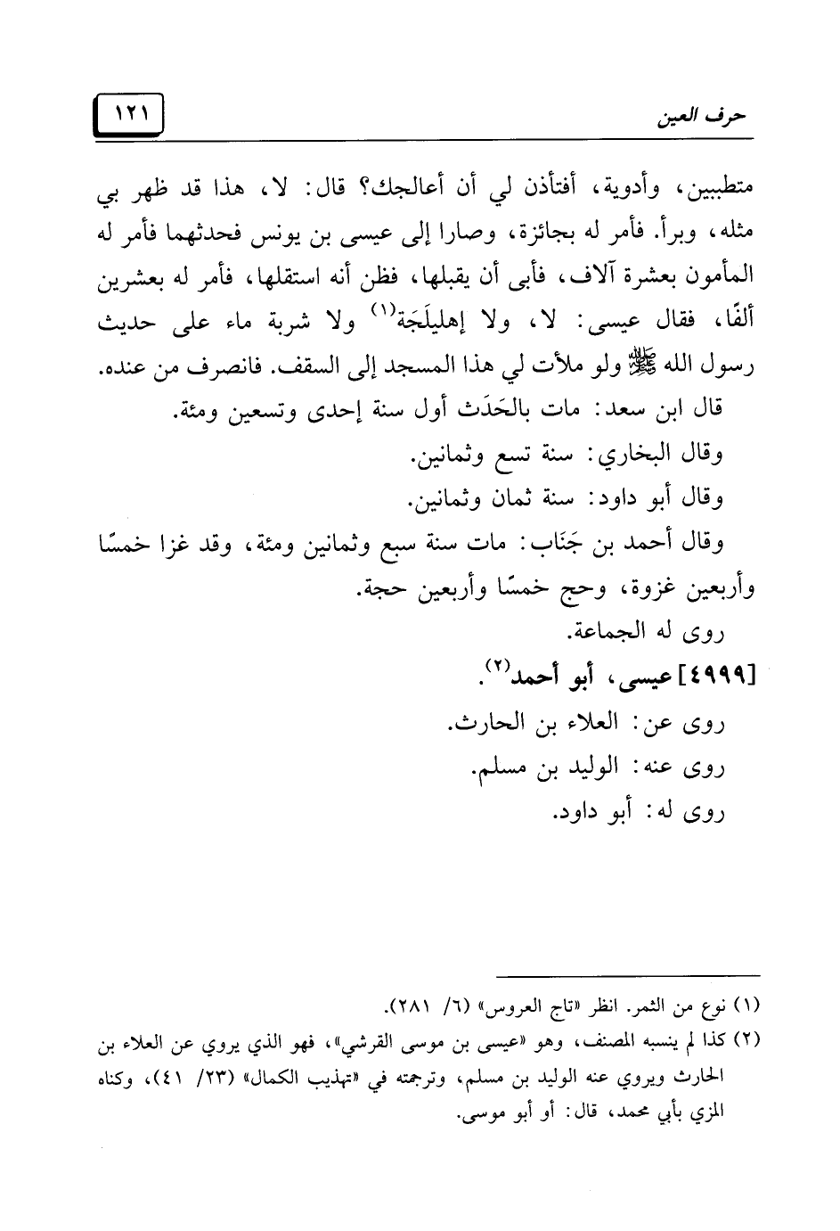 متطببين، وأدوية، أفتأذن لي أن أعالجك؟ قال: لا، هذا قد ظهر بي مثله، وبرأ. فأمر له بجائزة، وصارا إلى عيسى بن يونس فحدثهما فأمر له المأمون بعشرة آلاف، فأبى أن يقبلها، فظن أنه استقلها، فأمر له بعشرين ألفًا، فقال عيسى: لا، ولا إهليلَجَة (¬١) ولا شربة ماء على حديث رسول الله -صَلَّى اللهُ عَلَيْهِ وَسَلَّمَ- ولو ملأت لي هذا المسجد إلى السقف. فانصرف من عنده.