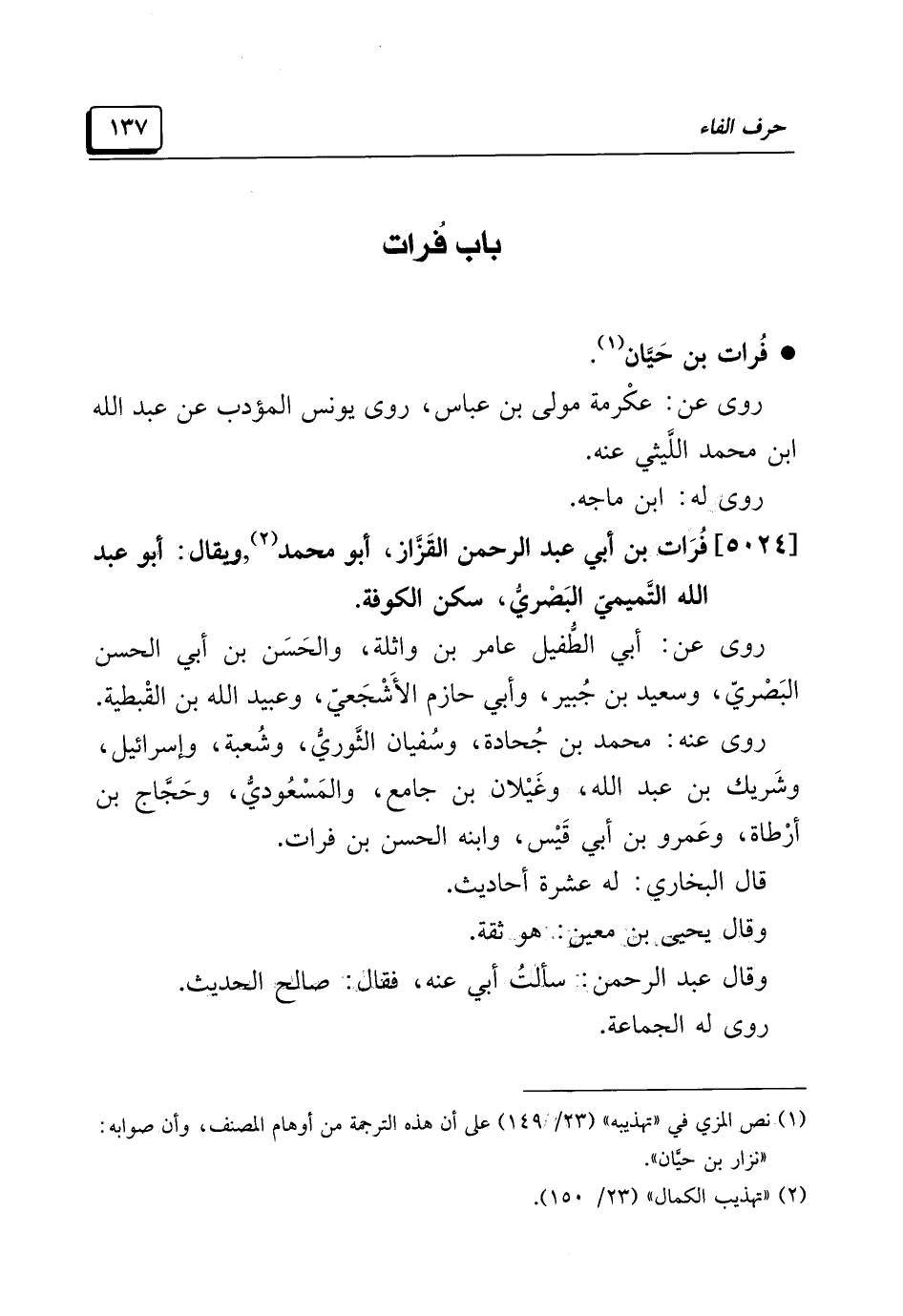 [٥٠٢٤] فُرَات بن أبي عبد الرحمن القَزَّاز، أبو محمد (¬٢) ويقال: أبو عبد الله التَّميميّ البَصْريُّ، سكن الكوفة.