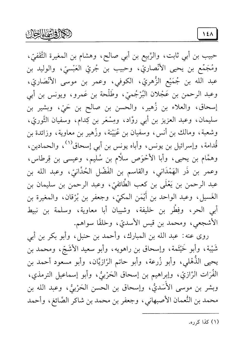 حبيب بن أبي ثابت، والرَّبيع بن أبي صالح، وهشام بن المغيرة الثَّقَفيّ، ومُجَمّع بن يحيى الأنْصاريّ، وحبيب بن جُريّ العَبْسيّ، والوليد بن عبد الله بن جُمَيْع الزُّهريّ، الكوفي، وعمر بن موسى الأنْصَاريّ، وعبد الرحمن بن عَجْلان البُرْجُميّ، وطَلْحة بن عَمرو، ويونس بن أبي إسحاق، والعلاء بن زُهير، والحسن بن صالح بن حَيّ، وبشير بن سليمان، وعبد العزيز بن أبي روَّاد، ومِسْعَر بن كِدام، وسفيان الثَّوريّ، وشعبة، ومالك بن أنس، وسفيان بن عُيَيْنة، وزُهير بن معاوية، وزائدة بن قُدامة، وإسرائيل بن يونس، وأباه يونس بن أبي إسحاق (¬١)، والحمادين، وهمَّام بن يحيى، وأبا الأحْوَص سلَّام بن سُليم، وعيسى بن قِرطاس، وعمر بن ذَر الهَمْدَاني، والقاسم بن الفَضْل الحُدَّانيّ، وعبد الله بن عبد الرحمن بن يَعْلَي بن كعب الطَّائفيّ، وعبد الرحمن بن سليمان بن الغَسيل، وعبد الواحد بن أَيْمَن المكيّ، وجعفر بن بُرْقان، والمغيرة بن أبي الحر، وفِطْر بن خليفة، وشيبان أبا معاوية، وسلمة بن نبيط الأشجعي، ومحمد بن قيس الأسديّ، وخلقًا سواهم.
