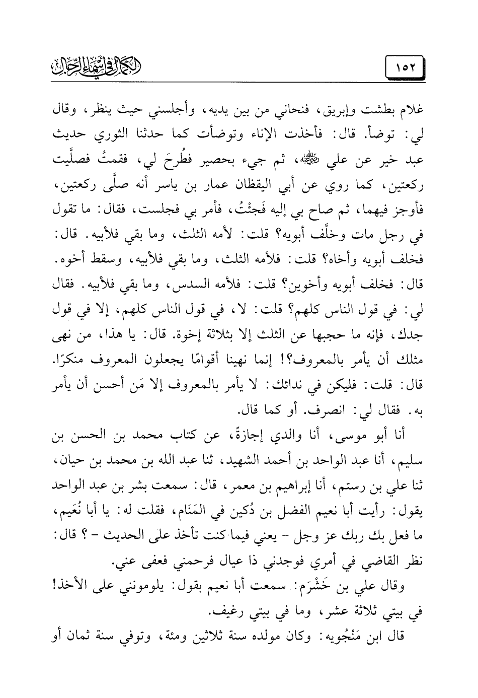 غلام بطشت وإبريق، فنحاني من بين يديه، وأجلسني حيث ينظر، وقال لي: توضأ. قال: فأخذت الإناء وتوضأت كما حدثنا الثوري حديث عبد خير عن علي -رَضِيَ اللهُ عَنْهُ-، ثم جيء بحصير فطُرحَ لي، فقمتُ فصلَّيت ركعتين، كما روى عن أبي اليقظان عمار بن ياسر أنه صلَّى ركعتين، فأوجز فيهما، ثم صاح بي إليه فَجئْتُ، فأمر بي فجلست، فقال: ما تقول في رجل مات وخلَّف أبويه؟ قلت: لأمه الثلث، وما بقي فلأبيه. قال: فخلف أبويه وأخاه؟ قلت: فلأمه الثلث، وما بقي فلأبيه، وسقط أخوه. قال: فخلف أبويه وأخوين؟ قلت: فلأمه السدس، وما بقي فلأبيه. فقال لي: في قول الناس كلهم؟ قلت: لا، في قول الناس كلهم، إلا في قول جدك، فإنه ما حجبها عن الثلث إلا بثلاثة إخوة. قال: يا هذا، من نهي مثلك أن يأمر بالمعروف؟ ! إنما نهينا أقوامًا يجعلون المعروف منكرًا. قال: قلت: فليكن في ندائك: لا يأمر بالمعروف إلا مَن أحسن أن يأمر به. فقال لي: انصرف. أو كما قال.