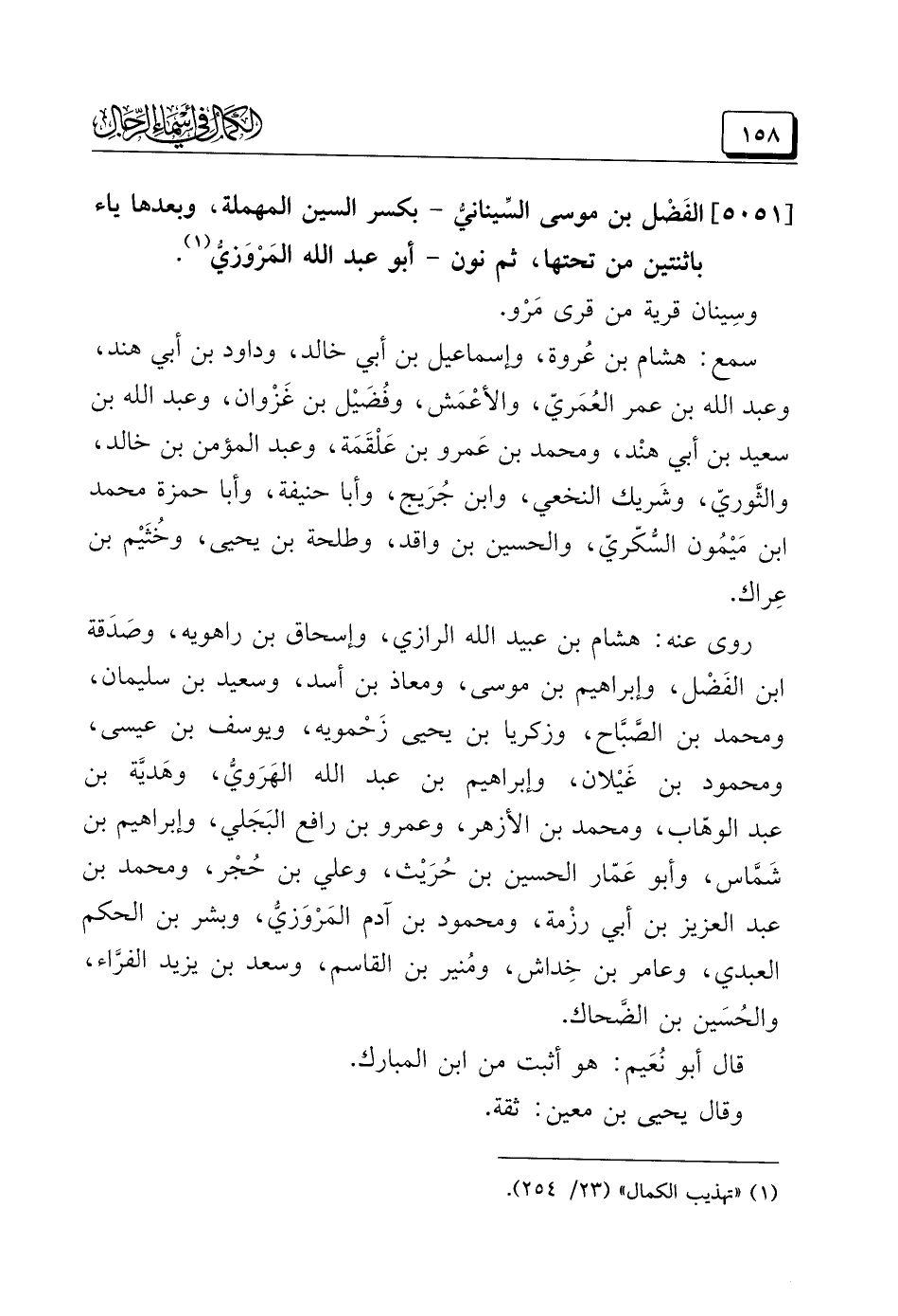[٥٠٥١] الفَضْل بن موسى السِّينانيُّ -بكسر السين المهملة، وبعدها ياء باثنتين من تحتها، ثم نون- أبو عبد الله المَرْوَزيُّ (¬١).