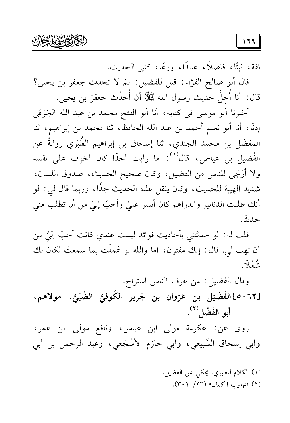 أخبرنا أبو موسى في كتابه، أنا أبو الفتح محمد بن عبد الله الخِرَقي إذنًا، أنا أبو نعيم أحمد بن عبد الله الحافظ، ثنا محمد بن إبراهيم، ثنا المفضَّل بن محمد الجندي، ثنا إسحاق بن إبراهيم الطَّبَري روايةً عن الفُضيل بن عياض، قال (¬١): ما رأيت أحدًا كان أخوف على نفسه ولا أرْجَي للناس من الفضيل، وكان صحيح الحديث، صدوق اللسان، شديد الهيبة للحديث، وكان يثقل عليه الحديث جدًّا، وربما قال لي: لو أنك طلبت الدنانير والدراهم كان أيسر عليَّ وأحبّ إليَّ من أن تطلب مني حديثًا.