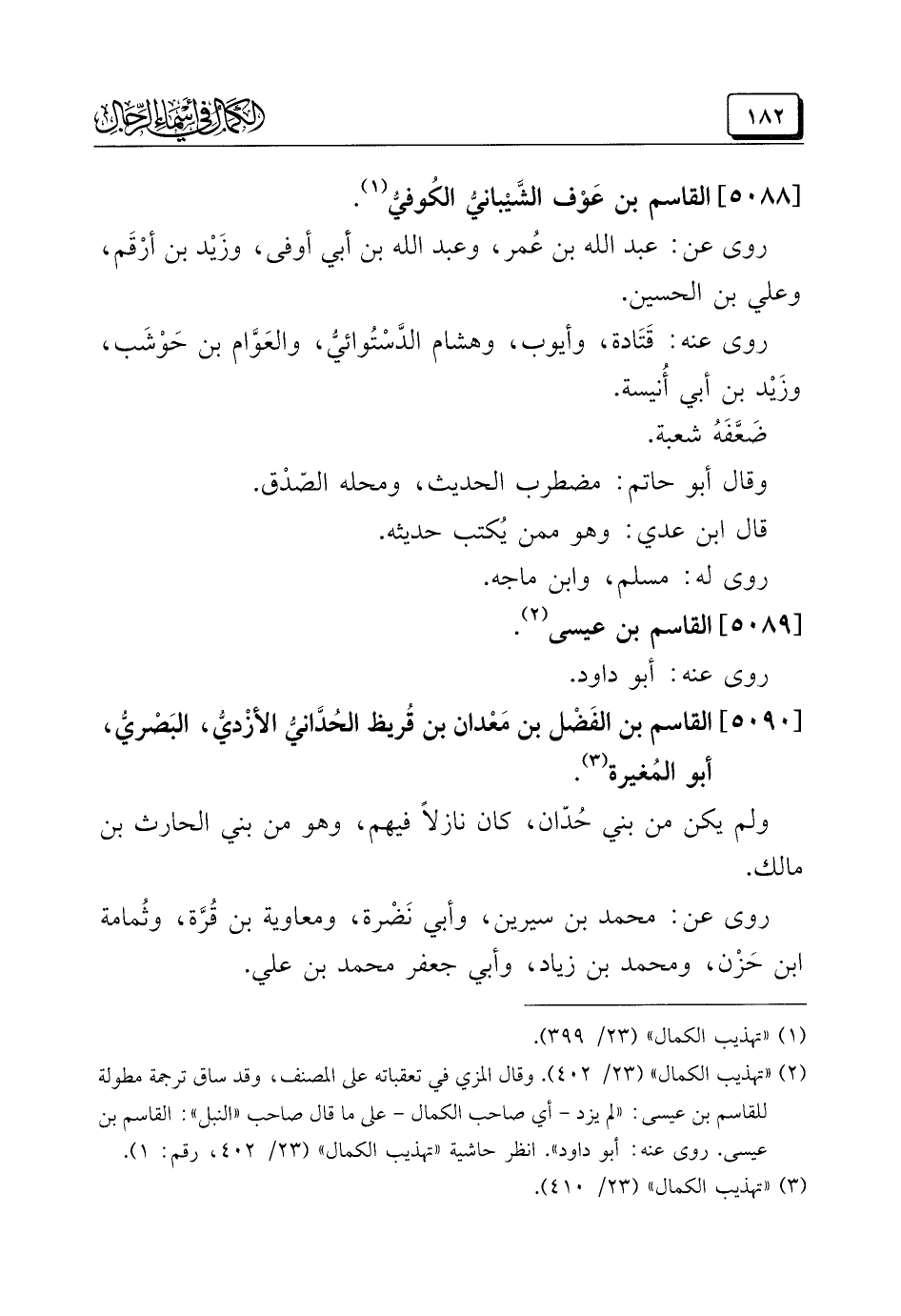(¬٢) "تهذيب الكمال" (٢٣/ ٤٠٢). وقال المزي في تعقباته على المصنف، وقد ساق ترجمة مطولة للقاسم بن عيسى: "لم يزد -أي صاحب الكمال- على ما قال صاحب "النبل": القاسم بن عيسي. وروى عنه: أبو داود". انظر حاشية "تهذيب الكمال" (٢٣/ ٤٠٢، رقم: ١).