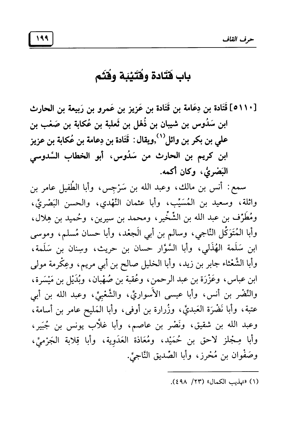 [٥١١٠] قَتَادة بن دِعَامة بن قَتَادة بن عَزيز بن عَمرو بن رَبيعة بن الحارث ابن سَدُوس بن شيبان بن ذُهْل بن ثَعلبة بن عُكابة بن صَعْب بن علي بن بكر بن وائل (¬١) ويقال: قَتَادة بن دِعامة بن عُكابة بن عزيز ابن كريم بن الحارث من سَدُوس، أبو الخطاب السَّدوسي البَصْريُّ، وكان أكمه.