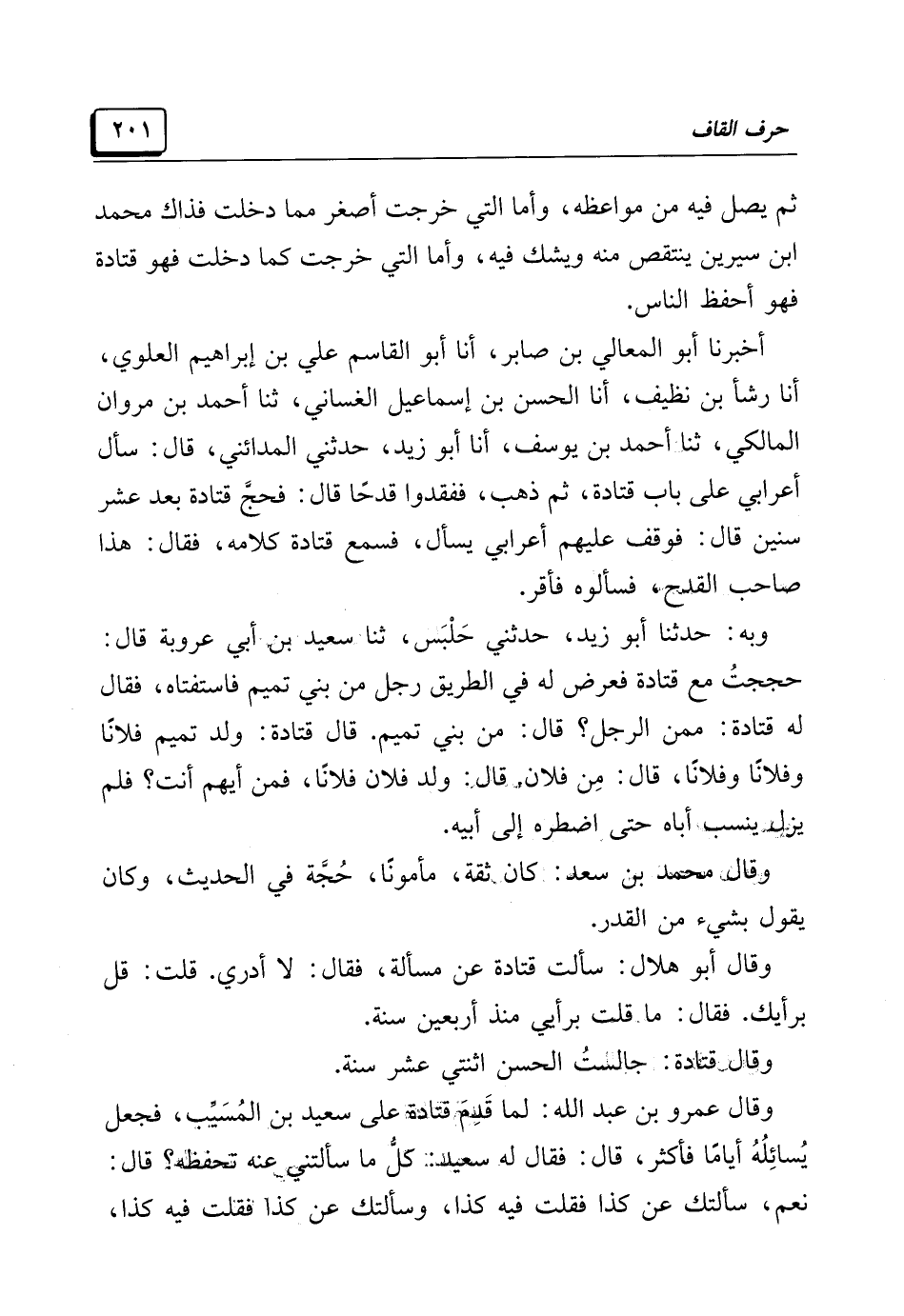 وبه: حدثنا أبو زيد، حدثني حَلْبَس، ثنا سعيد بن أبي عروبة قال: حججتُ مع قتادة فعرض له في الطريق رجل من بني تميم فاستفتاه، فقال له قتادة: ممن الرجل؟ قال: من بني تميم. قال قتادة: ولد تميم فلانًا وفلانًا وفلانًا، قال: مِن فلان. قال: ولد فلان فلانًا، فمن أيهم أنت؟ فلم يزل ينسب أباه حتى اضطره إلى أبيه.
