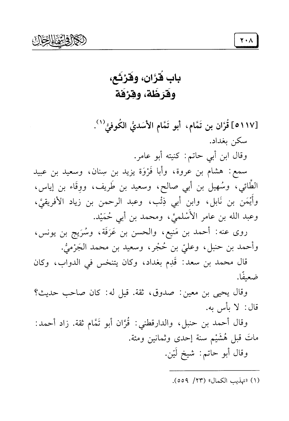 [٥١١٧] قُرَّان بن تَمَّام، أبو تَمَّام الأسَديُّ الكُوفيُّ (¬١).