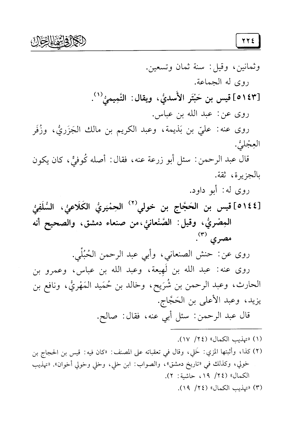 (¬٢) كذا، وأثبتها المزي: خَلي، وقال في تعقباته على المصنف: "كان فيه: قيس بن الحجاج بن خولي، وكذلك في "تاريخ دمشق"، والصواب: ابن خلي، وخلي وخولي أخوان". "تهذيب الكمال" (٢٤/ ١٩، حاشية: ٢).
