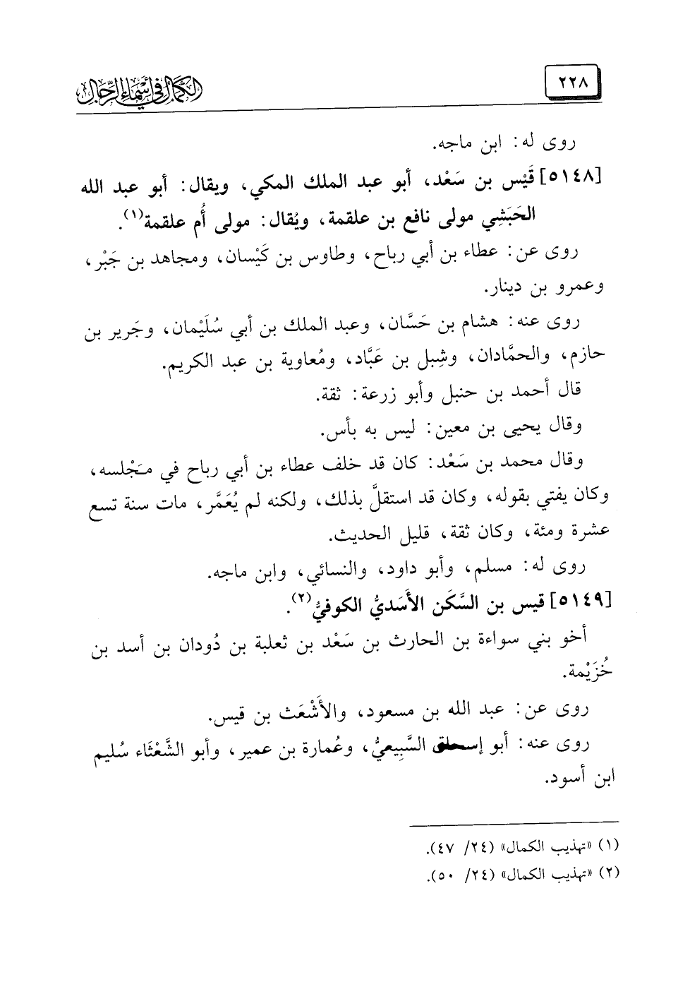 [٥١٤٨] قيْس بن سَعْد، أبو عبد الملك المكي، ويقال: أبو عبد الله الحَبَشِي مولي نافع بن علقمة، ويُقال: مولى أُم علقمة (¬١).