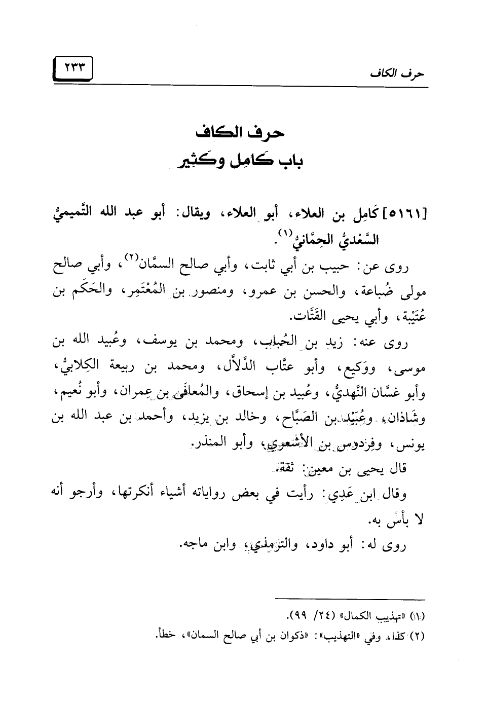 [٥١٦١] كامِل بن العلاء، أبو العلاء، ويقال: أبو عبد الله التَّميميُّ السَّعْديُّ الحِمَّانيُّ (¬١).