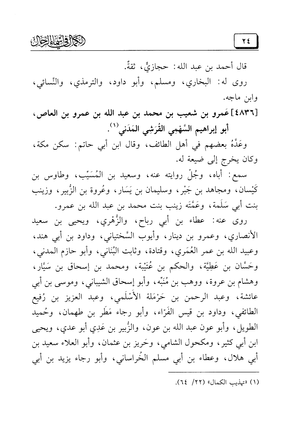 [٤٨٣٦] عَمرو بن شعيب بن محمد بن عبد الله بن عمرو بن العاص، أبو إبراهيم السَّهْمِي القُرَشِي المَدَني (¬١).