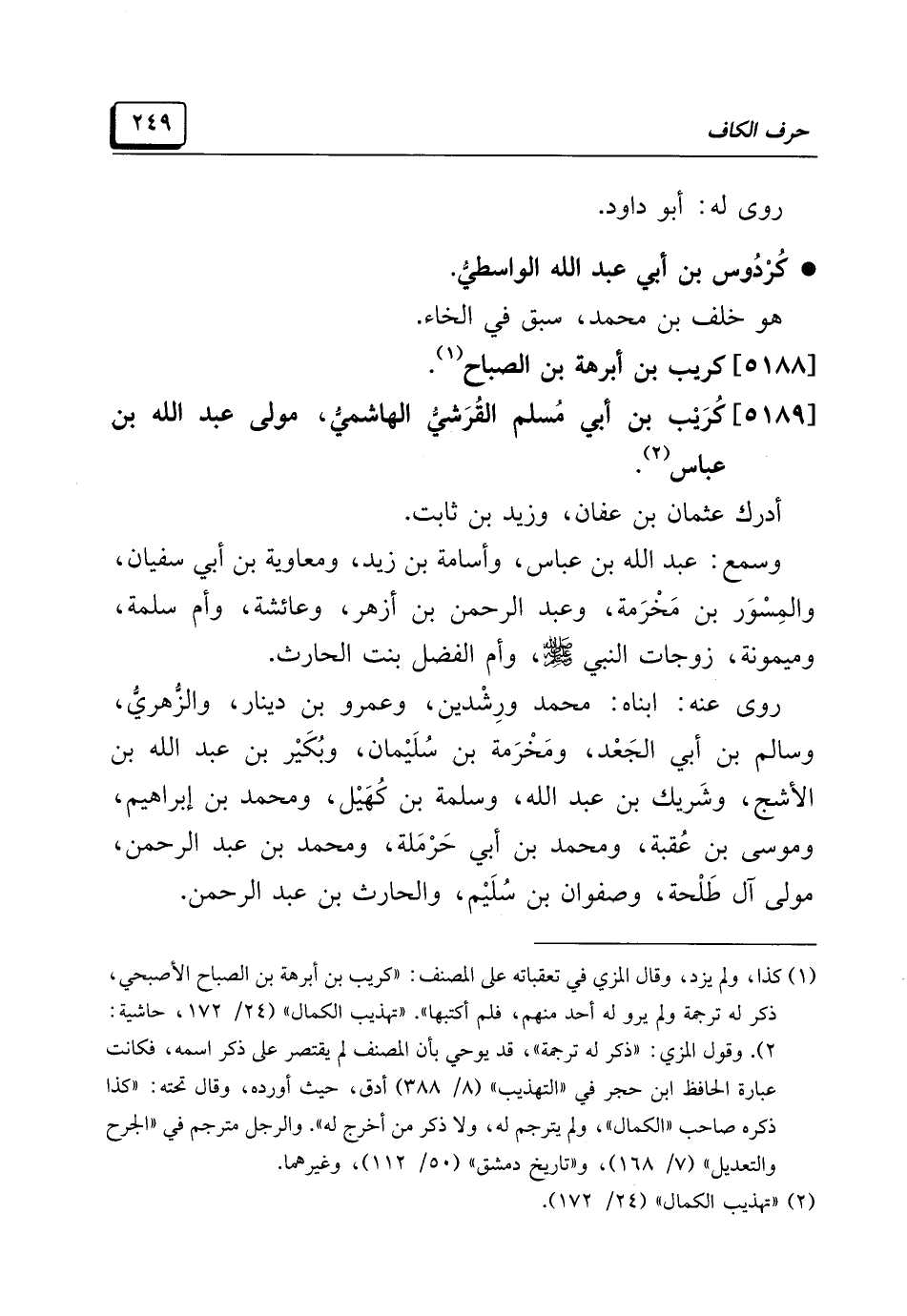 (¬١) كذا، ولم يزد، وقال المزي في تعقباته على المصنف: "كريب بن أبرهة بن الصباح الأصبحي، ذكر له ترجمة ولم يرو له أحد منهم، فلم أكتبها". "تهذيب الكمال" (٢٤/ ١٧٢، حاشية: ٢). وقول المزي: "ذكر له ترجمة"، قد يوحي بأن المصنف لم يقتصر على ذكر اسمه، فكانت عبارة الحافظ ابن حجر في "التهذيب" (٨/ ٣٨٨) أدق، حيث أورده، وقال تحته: "كذا ذكره صاحب "الكمال"، ولم يترجم له، ولا ذكر من أخرج له". والرجل مترجم في "الجرح والتعديل" (٧/ ١٦٨)، و"تاريخ دمشق" (٥٠/ ١١٢)، وغيرهما.