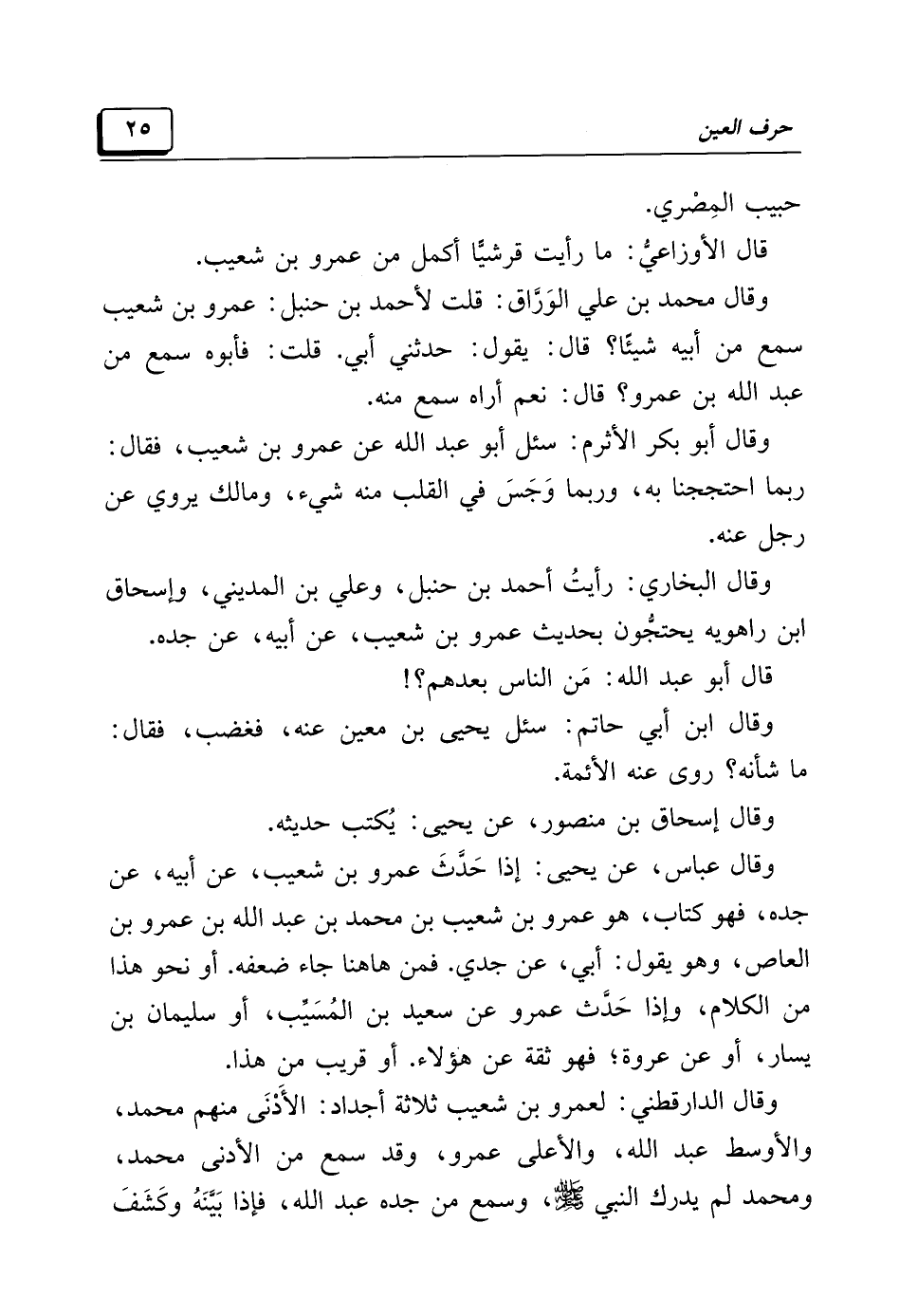 وقال عباس، عن يحيى: إذا حَدَّثَ عمرو بن شعيب، عن أبيه، عن جده، فهو كتاب، هو عمرو بن شعيب بن محمد بن عبد الله بن عمرو بن العاص، وهو يقول: أبي، عن جدي. فمن هاهنا جاء ضعفه. أو نحو هذا من الكلام، وإذا حَدَّث عمرو عن سعيد بن المُسَيِّب، أو سليمان بن يسار، أو عن عروة؛ فهو ثقة عن هؤلاء. أو قريب من هذا.