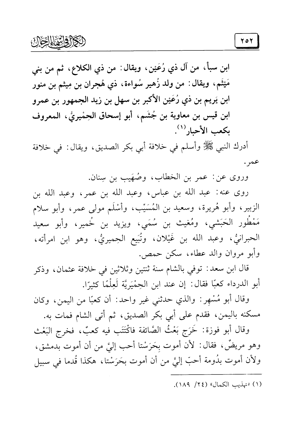 ابن سبأ، من آل ذي رُعَيْن، ويقال: من ذي الكلاع، ثم من بني مَيْثَم، ويقال: من ولد زُهير سُواءة، ذي هُجران بن مِيثم بن منور ابن يَريم بن ذي رُعَيْن الأكبر بن سهل بن زيد الجمهور بن عمرو ابن قيس بن معاوية بن جُشَم، أبو إسحاق الحِمْيريُّ، المعروف بكعب الأحبار (¬١).