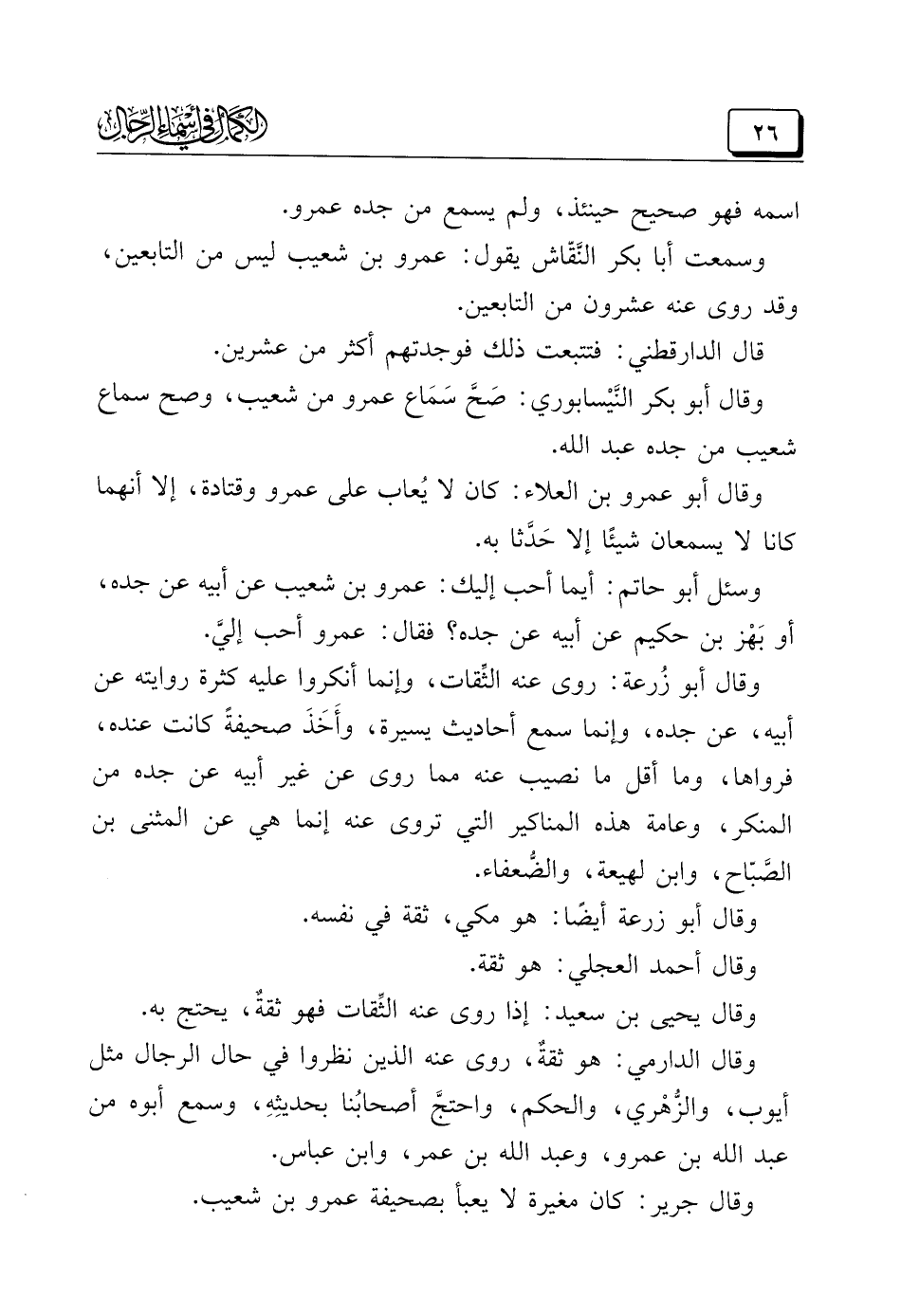 وقال أبو بكر النَّيْسابوري: صَحَّ سَمَاع عمرو من شعيب، وصح سماع شعيب من جده عبد الله.