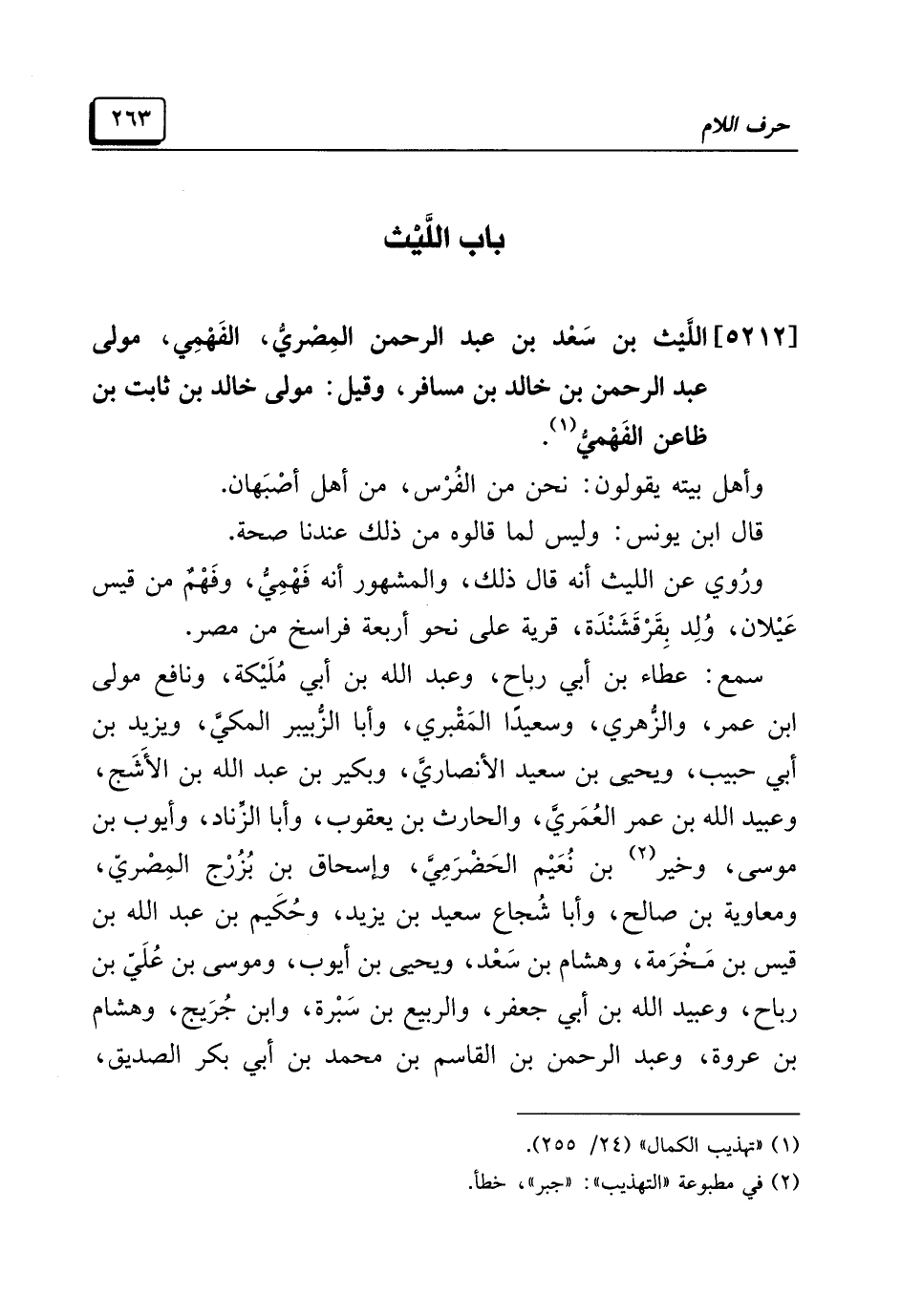 [٥٢١٢] اللَّيْث بن سَعْد بن عبد الرحمن المِصْريُّ، الفَهْمِي، مولي عبد الرحمن بن خالد بن مسافر، وقيل: مولي خالد بن ثابت بن ظاعن الفَهْميُّ (¬١).
