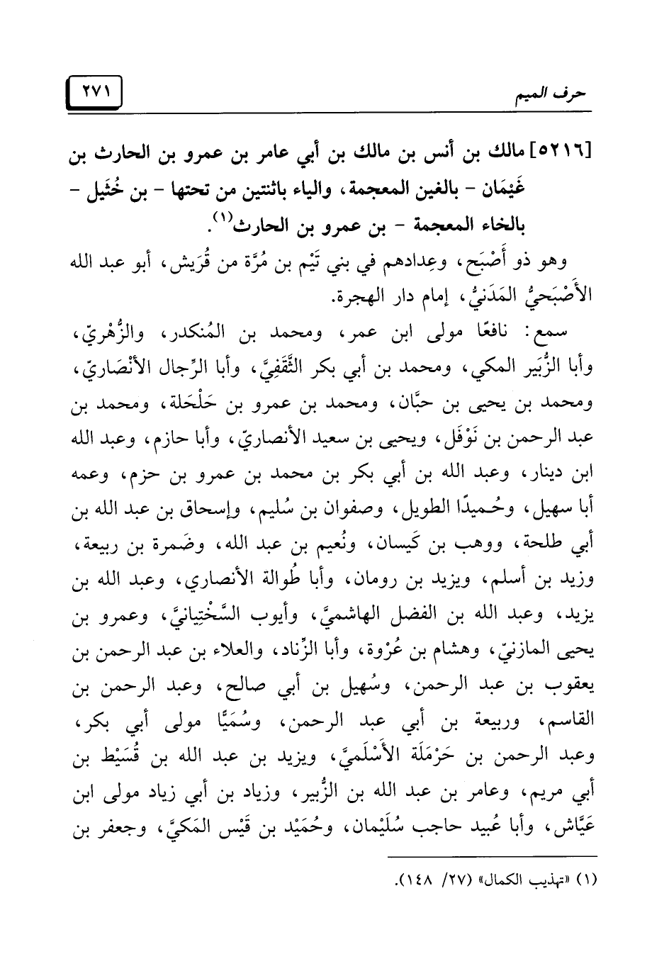 [٥٢١٦] مالك بن أنس بن مالك بن أبي عامر بن عمرو بن الحارث بن غَيْمَان -بالغين المعجمة، والياء باثنتين من تحتها- بن خُثَيل -بالخاء المعجمة- بن عمرو بن الحارث (¬١).