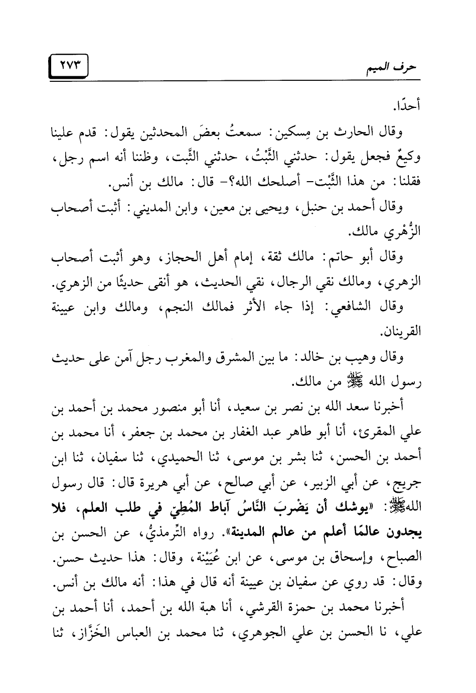 أخبرنا سعد الله بن نصر بن سعيد، أنا أبو منصور محمد بن أحمد بن على المقرئ، أنا أبو طاهر عبد الغفار بن محمد بن جعفر، أنا محمد بن أحمد بن الحسن، ثنا بشر بن موسي، ثنا الحميدي، ثنا سفيان، ثنا ابن جريج، عن أبي الزبير، عن أبي صالح، عن أبي هريرة قال: قال رسول الله -صَلَّى اللهُ عَلَيْهِ وَسَلَّمَ-: "يوشك أن يَضْربَ النَّاسُ آباط المُطِيّ في طلب العلم، فلا يجدون عالمًا أعلم من عالم المدينة". رواه التِّرمذيُّ، عن الحسن بن الصباح، وإسحاق بن موسى، عن ابن عُيَيْنة، وقال: هذا حديث حسن. وقال: قد روى عن سفيان بن عيينة أنه قال في هذا: أنه مالك بن أنس.