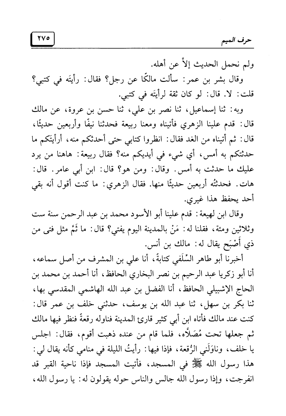 أخبرنا أبو طاهر السِّلَفي كتابةً، أنا علي بن المشرف من أصل سماعه، أنا أبو زكريا عبد الرحيم بن نصر البخاري الحافظ، أنا أحمد بن محمد بن الحاج الإشبيلي الحافظ، أنا الفضل بن عبد الله الهاشمي المقدسي بها، ثنا بكر بن سهل، ثنا عبد الله بن يوسف، حدثني خلف بن عمر قال: كنت عند مالك فأتاه ابن أبي كثير قارئ المدينة فناوله رقعةً فنظر فيها مالك ثم جعلها تحت مُصَلَّاه، فلما قام من عنده ذهبت أقوم، فقال: اجلس يا خلف، وناوَلَني الرُّقعة، فإذا فيها: رأيتُ الليلة في منامي كأنه يقال لي: هذا رسول الله -صَلَّى اللهُ عَلَيْهِ وَسَلَّمَ- في المسجد، فأتيت المسجد فإذا ناحية القبر قد انفرجت، وإذا رسول الله جالس والناس حوله يقولون له: يا رسول الله،
