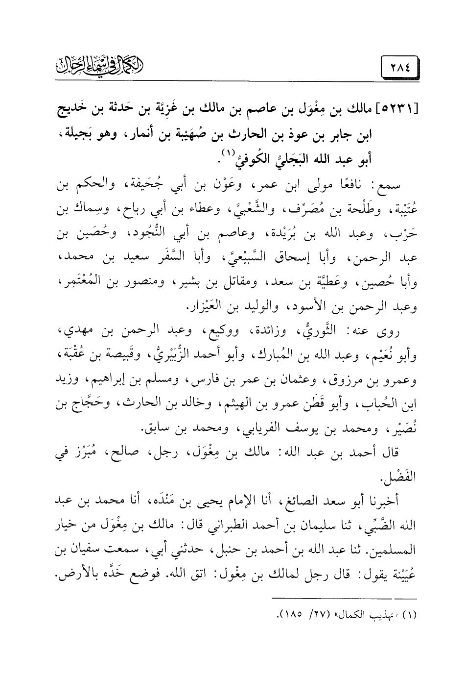 [٥٢٣١] مالك بن مِغْوَل بن عاصم بن مالك بن غَزِيَّة بن حَدثة بن خَديج ابن جابر بن عوذ بن الحارث بن صُهَيْبة بن أنمار، وهو بَجيلة، أبو عبد الله البَجَليُّ الكُوفيُّ (¬١).