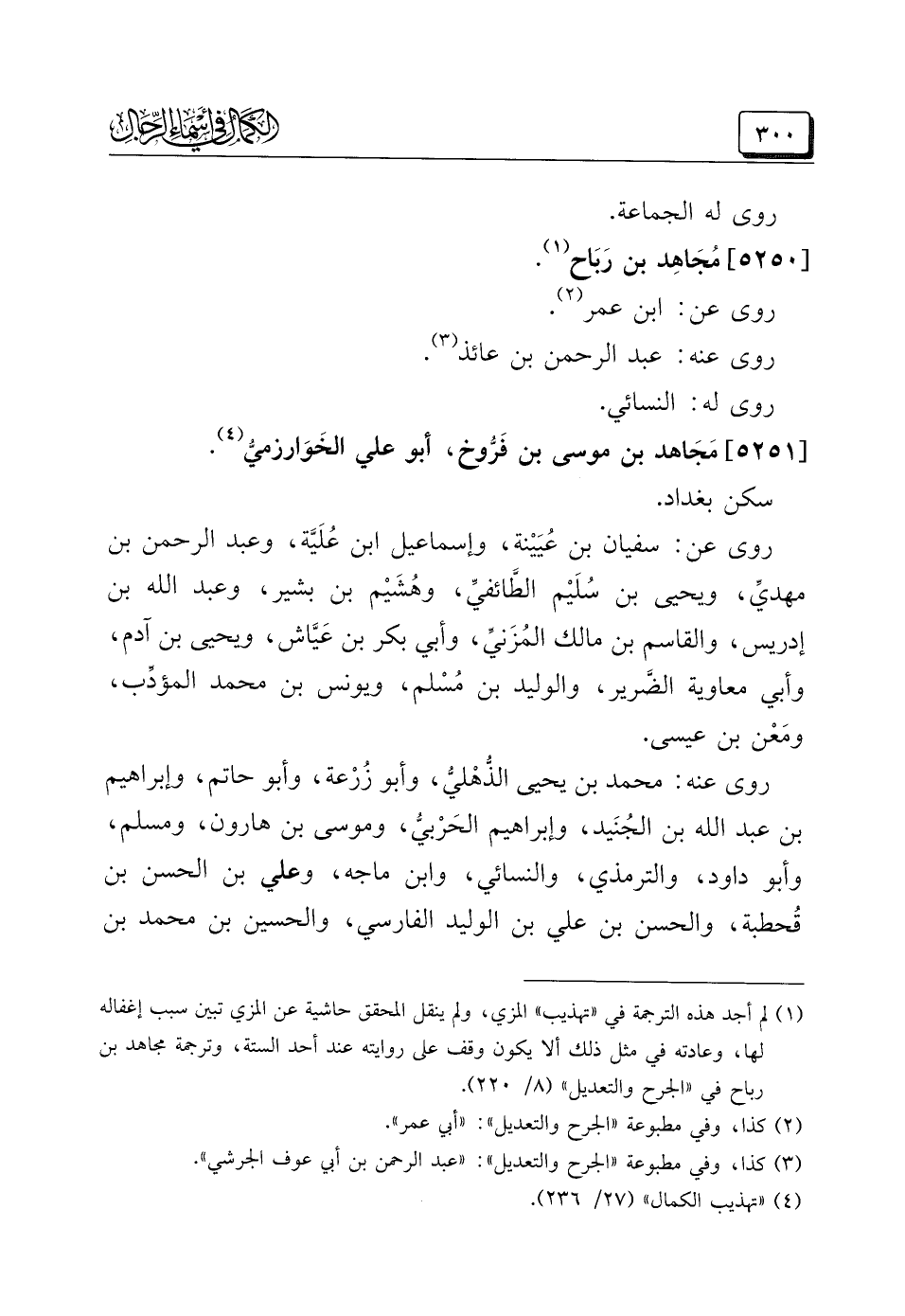 (¬١) لم أجد هذه الترجمة في "تهذيب" المزي، ولم ينقل المحقق حاشية عن المزي تبين سبب إغفاله لها، وعادته في مثل ذلك ألا يكون وقف على روايته عند أحد الستة، وترجمة مجاهد بن رباح في "الجرح والتعديل" (٨/ ٢٢٠).