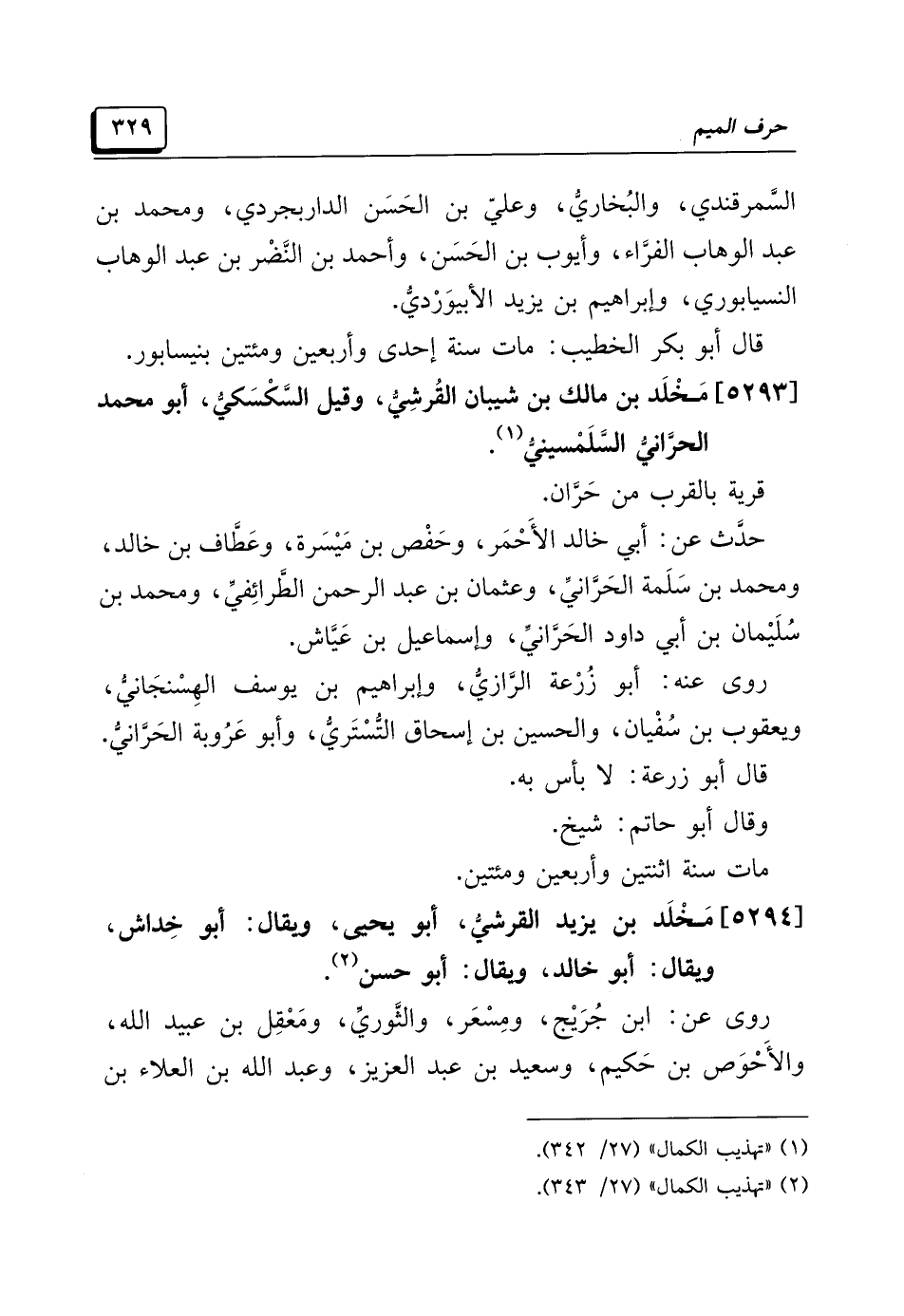 [٥٢٩٣] مَخْلَد بن مالك بن شيبان القُرَشِيُّ، وقيل السَّكْسَكيُّ، أبو محمد الحَرَّاني السَّلَمْسينيُّ (¬١).