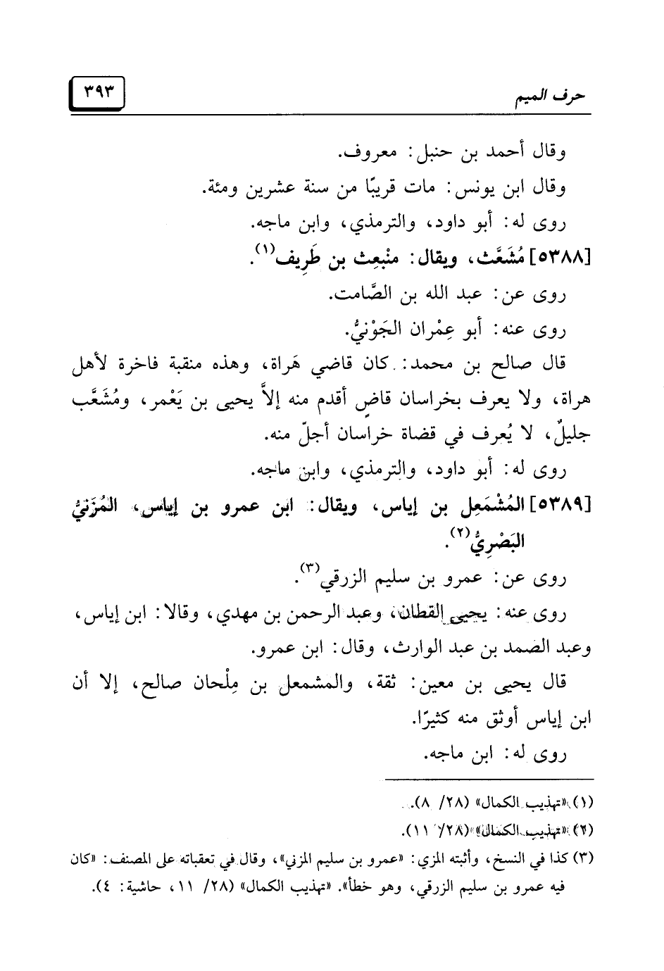 (¬٣) كذا في النسخ، وأثبته المزي: "عَمْرو بن سليم المزني"، وقال في تعقباته على المصنِّف: "كان فيه عَمْرو بن سليم الزرقي، وهو خطأ". "تهذيب الكمال" (٢٨/ ١١، حاشية: ٤).