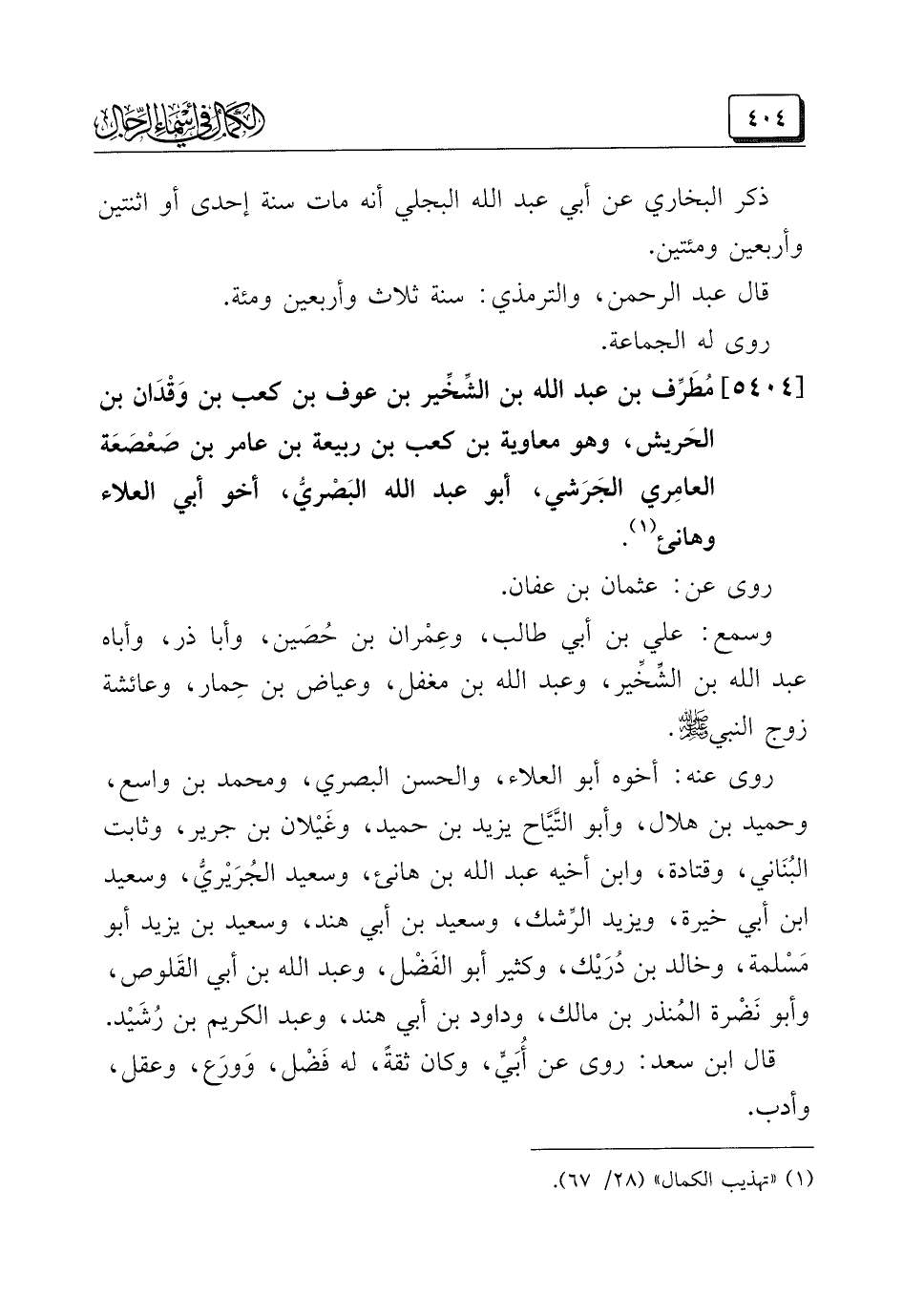[٥٤٠٤] مُطَرِّف بن عبد الله بن الشِّخِّير بن عَوْف بن كعب بن وَقْدَان بن الحَريش، وهو مُعَاوية بن كعب بن رَبِيعَة بن عامر بن صَعْصَعَة العامِري الجَرَشي، أبو عبد الله البَصْرِيُّ، أخو أبي العلاء وهانئ (¬١).