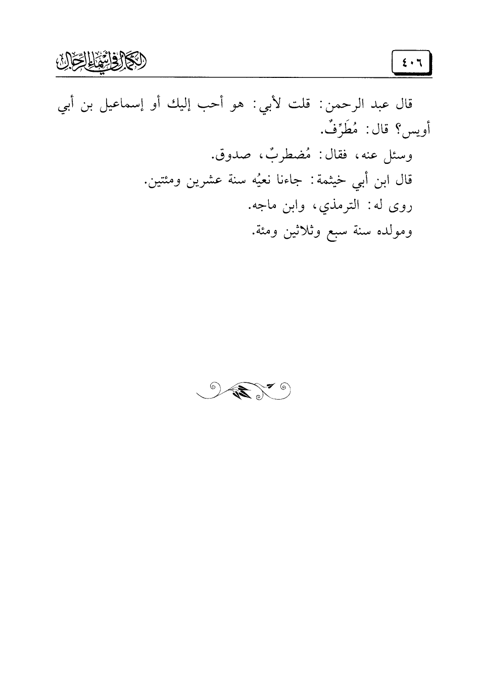 قال عبد الرحمن: قلت لأبي: هو أحب إليك أو إسماعيل بن أبي أويس؟ قال: مُطَرِّفٌ.