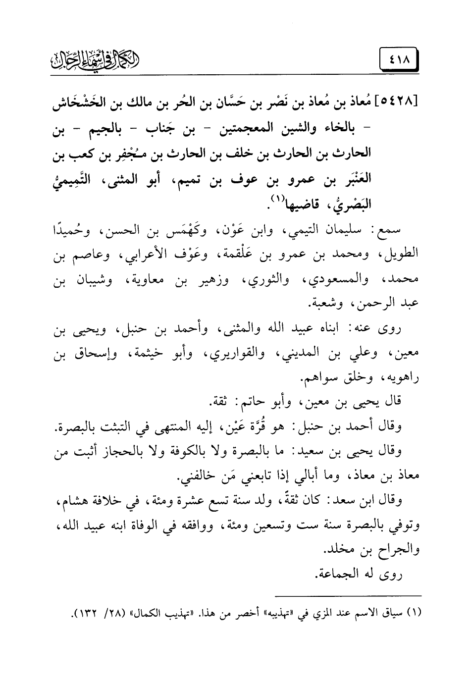 [٥٤٢٨] مُعاذ بن مُعاذ بن نَصْر بن حَسَّان بن الحُر بن مالك بن الخَشْخَاش -بالخاء والشين المعجمتين- بن جَناب -بالجيم- بن الحارث بن الحارث بن خَلَف بن الحارث بن مُجْفِر بن كعب بن العَنْبَر بن عَمْرو بن عَوْف بن تميم، أبو المثنى، التَّمِيميُّ البَصْرِيُّ، قاضيها (¬١).