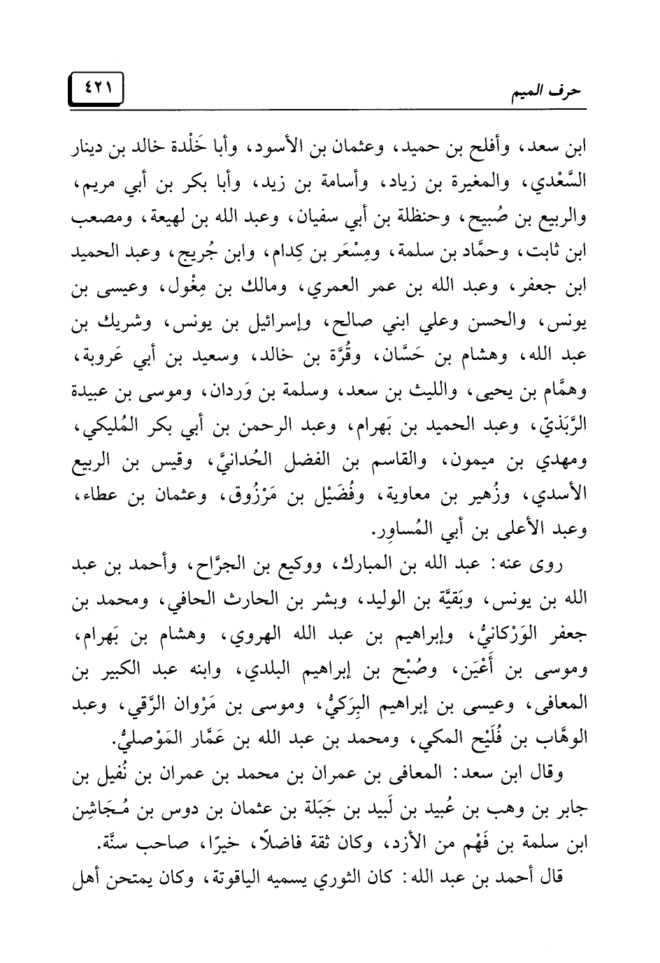 وقال ابن سعد: المعافي بن عِمْران بن محمد بن عِمْران بن نُفيل بن جابر بن وَهْب بن عُبَيْد بن لَبيد بن جَبَلة بن عثمان بن دوس بن مُجَاشِن ابن سَلَمَة بن فَهْم من الأزد، وكان ثقة فاضلًا، خيرًا، صاحب سنَّة.
