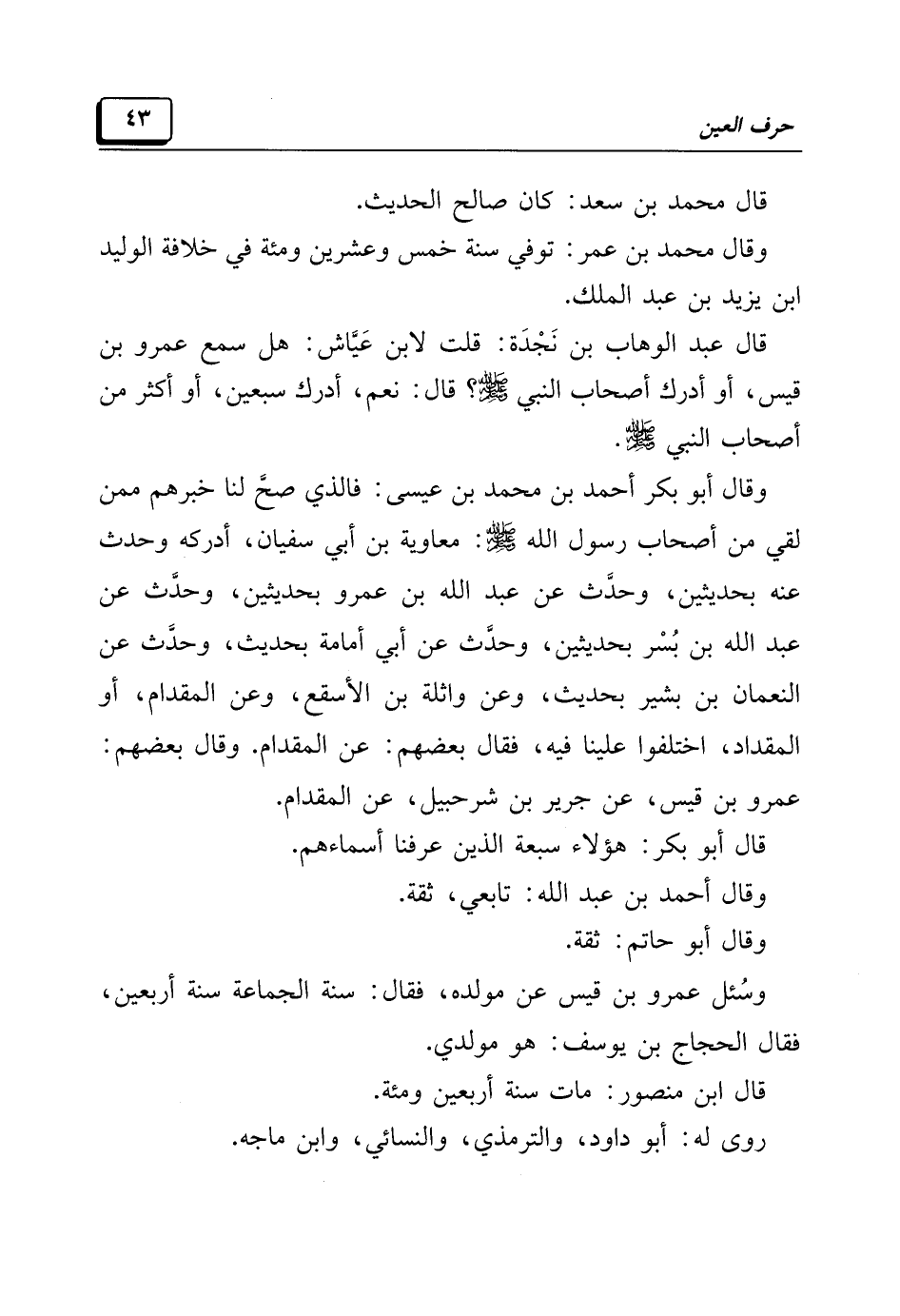 وقال أبو بكر أحمد بن محمد بن عيسي: فالذي صحَّ لنا خبرهم ممن لقي من أصحاب رسول الله -صَلَّى اللهُ عَلَيْهِ وَسَلَّمْ-: معاوية بن أبي سفيان، أدركه وحدث عنه بحديثين، وحدَّث عن عبد الله بن عمرو بحديثين، وحدَّث عن عبد الله بن بُسْر بحديثين، وحدث عن أبي أمامة بحديث، وحدَّث عن النعمان بن بشير بحديث، وعن واثلة بن الأسقع، وعن المقدام، أو المقداد، اختلفوا علينا فيه، فقال بعضهم: عن المقدام. وقال بعضهم: عمرو بن قيس، عن جرير بن شرحبيل، عن المقدام.