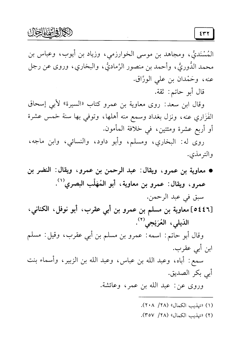 [٥٤٤٦] معاوية بن مسلم بن عمرو بن أبي عقرب، أبو نوفل، الكناني، الدّيلي، العُرَيْجي (¬٢).