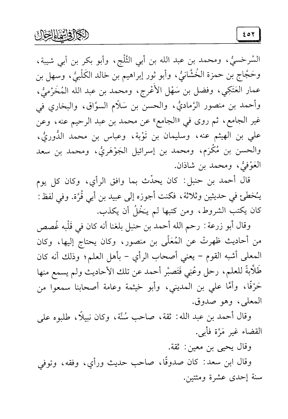 وقال أبو زرعة: رحم الله أحمد بن حَنْبَل بلغنا أنَّه كان في قَلْبه غُصص من أحاديث ظهرتْ عن المُعَلّي بن منصور، وكان يحتاج إليها، وكان المعلي أشبه القوم -يعني أصحاب الرأي- بأهل العلم؛ وذلك أنَّه كان طَلَّابةً للعلم، رحل وعُنِي فَتَصبَّر أحمد عن تلك الأحاديث ولم يسمع منها حَرْفًا، وأمَّا عليّ بن المَدِيني، وأبو خَيْثَمة وعامة أصحابنا سمعوا من المعلى، وهو صدوق.