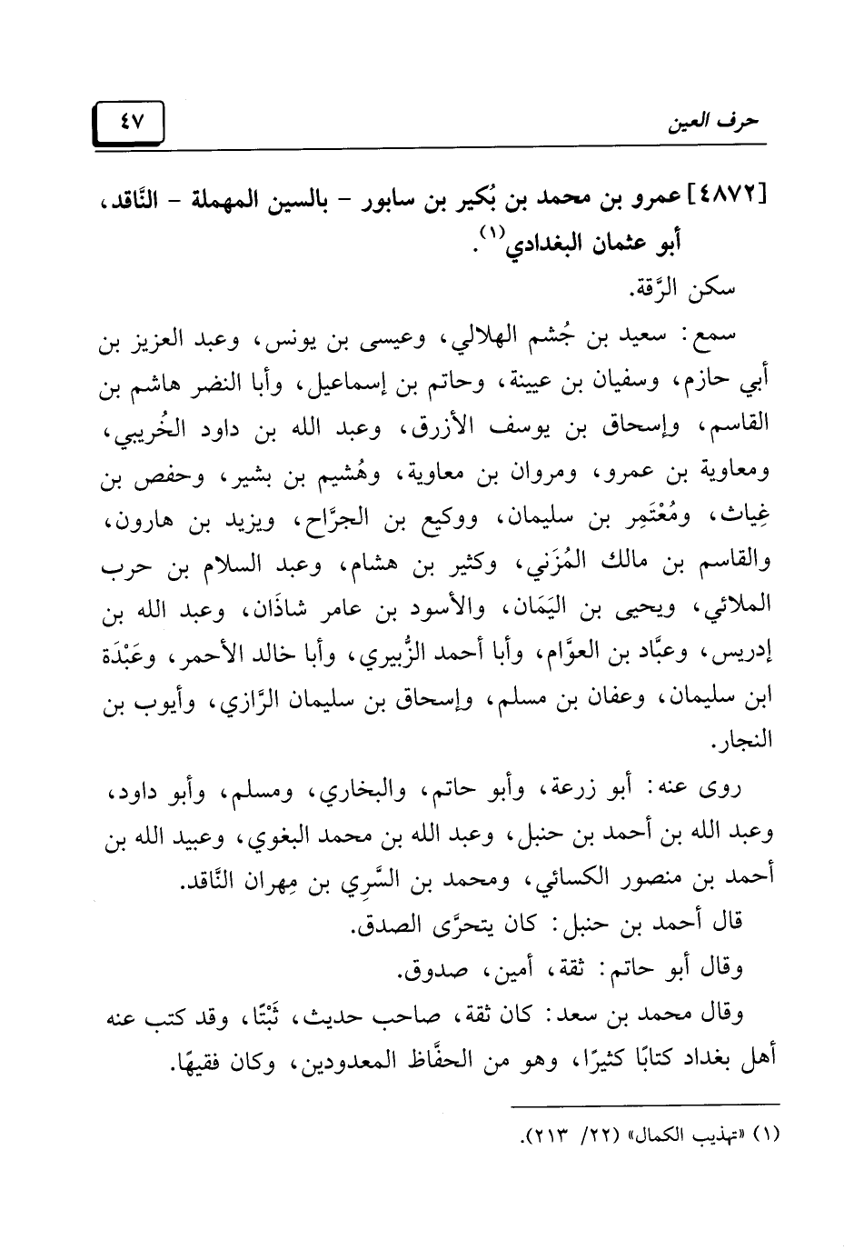 [٤٨٧٢] عمرو بن محمد بن بُكير بن سابور -بالسين المهملة- النَّاقد، أبو عثمان البغدادي (¬١).