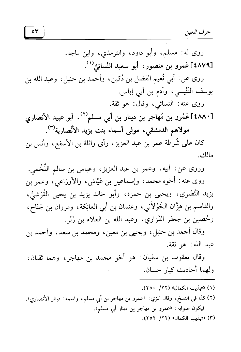 [٤٨٨٠] عَمْرو بن مُهاجر بن دينار بن أبي مسلم (¬٢)، أبو عبيد الأنصاري مولاهم الدمشقي، مولى أسماء بنت يزيد الأَنْصارية (¬٣).