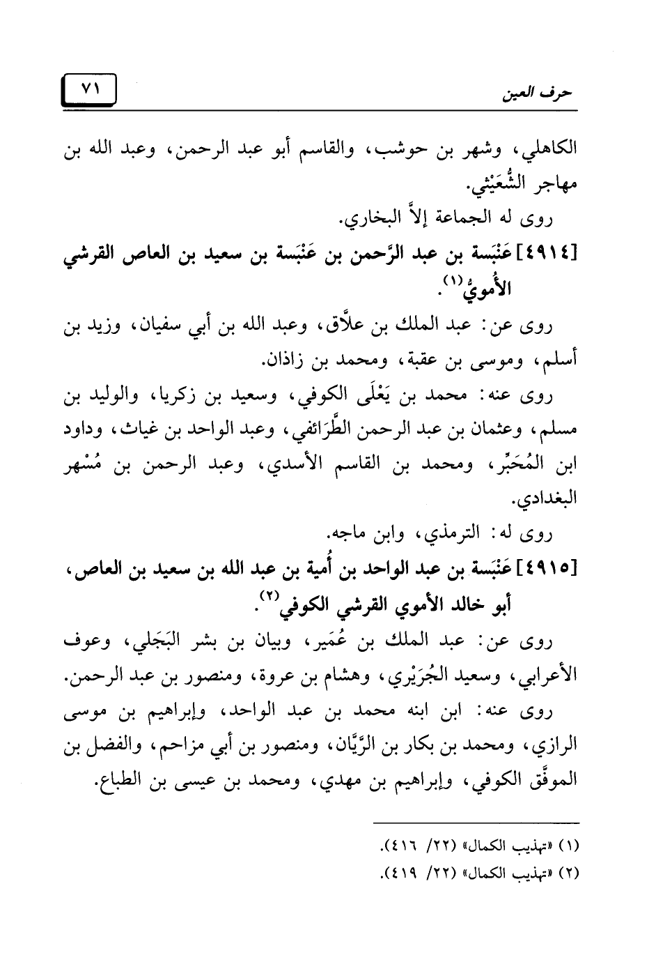 [٤٩١٥] عَنْبَسة بن عبد الواحد بن أُمية بن عبد الله بن سعيد بن العاص، أبو خالد الأموي القرشي الكوفي (¬٢).