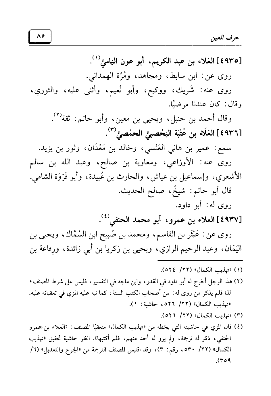 (¬٤) قال المزي في حاشيته التي بخطه من "تهذيب الكمال" متعقبًا المصنف: "العلاء بن عمرو الحنفي، ذكر له ترجمة، ولم يرو له أحد منهم، فلم أكتبها". انظر حاشية تحقيق "تهذيب الكمال" (٢٢/ ٥٣٠، رقم: ٣)، وقد اقتبس المصنف الترجمة من "الجرح والتعديل" (٦/ ٤٥٩).